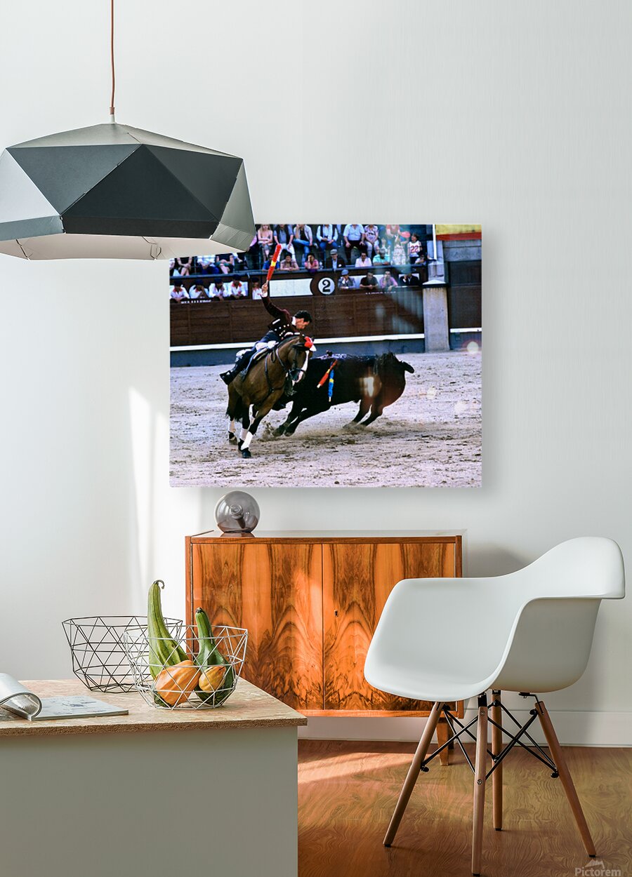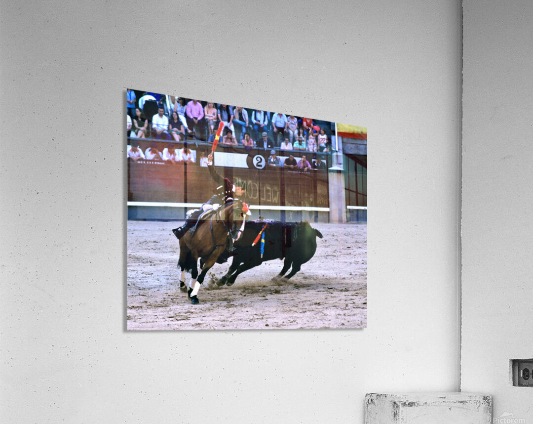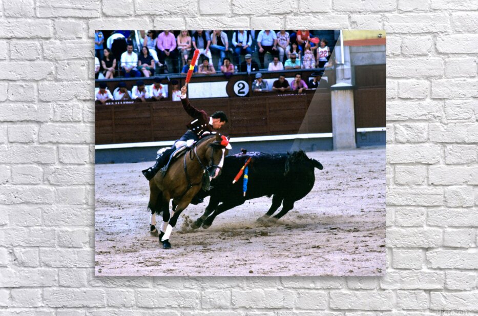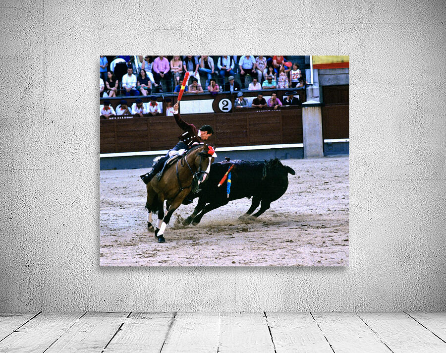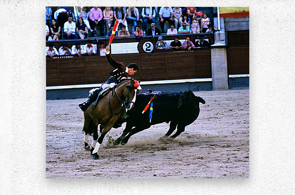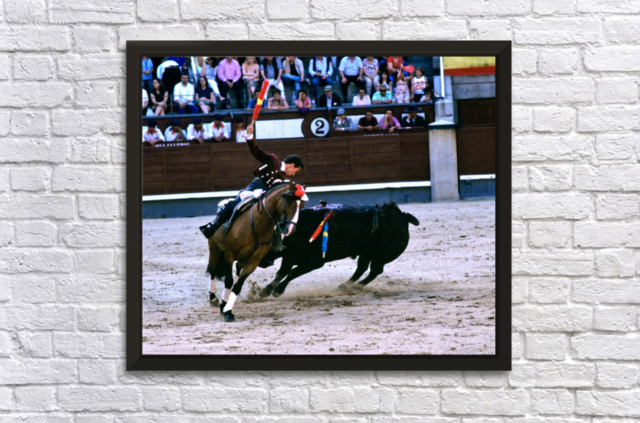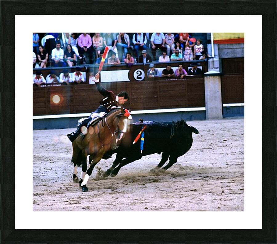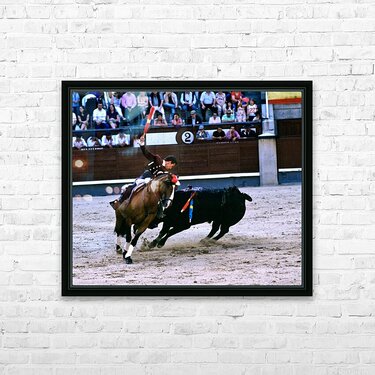 "Bullfight on horseback at Las Ventas Bullring in Madrid" in a framed print.