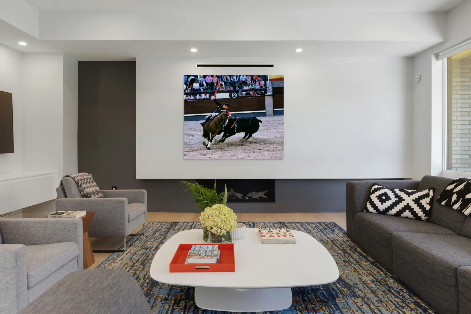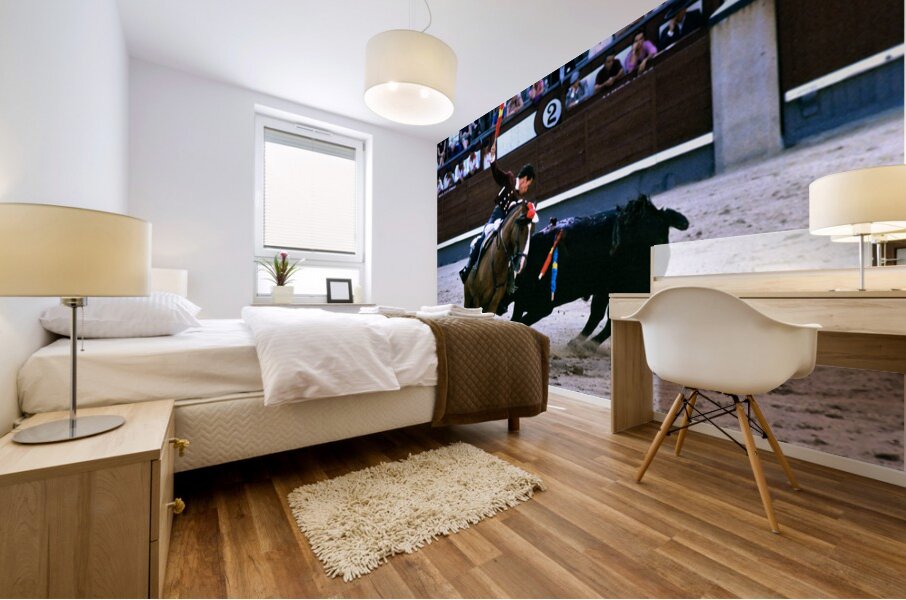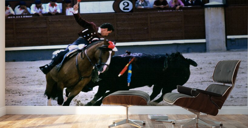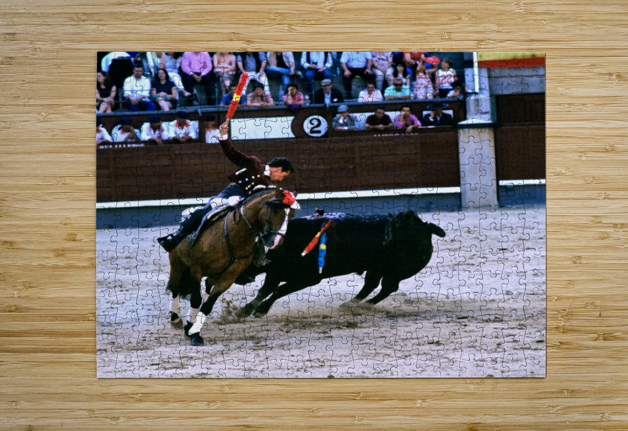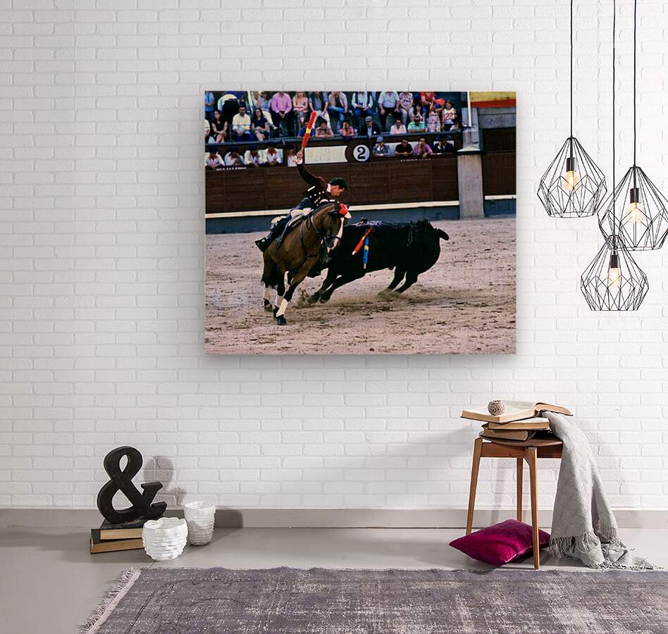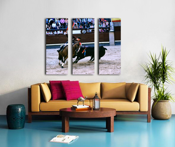 "Bullfight on horseback at Las Ventas Bullring in Madrid" in a framed print.