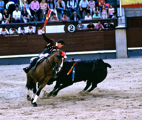 A horseman performs during a corrida de rejones bullfight at Las Ventas in Madrid engaging with a bull in the sandy arena.