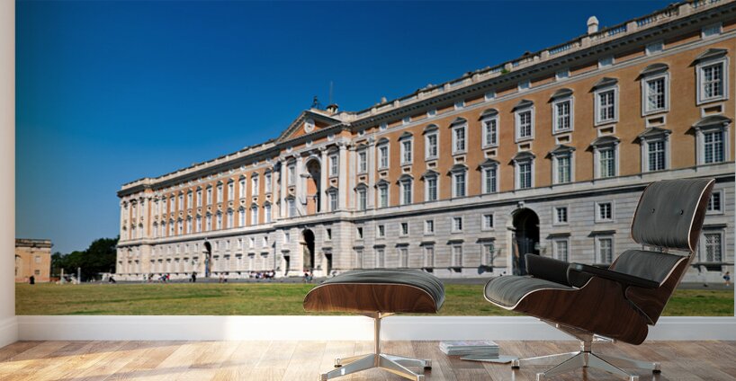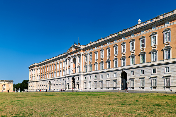 Visitors explore the large Royal Palace in Caserta. The palace features a vast structure with beautiful architecture under a clear blue sky.