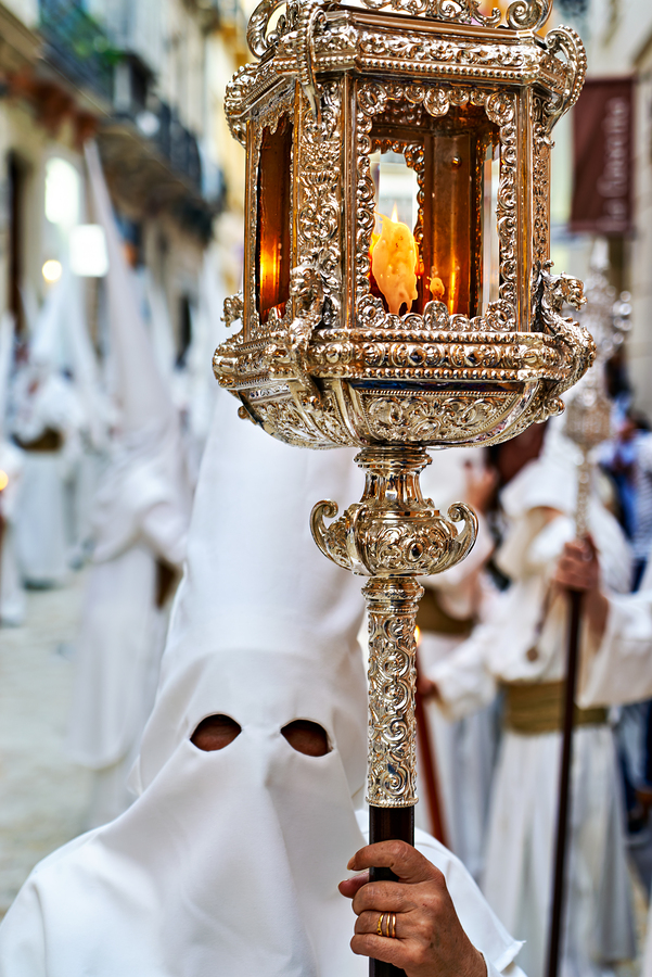 People take part in Easter Holy Week processions in Malaga. Participants hold lanterns as they walk through the streets.