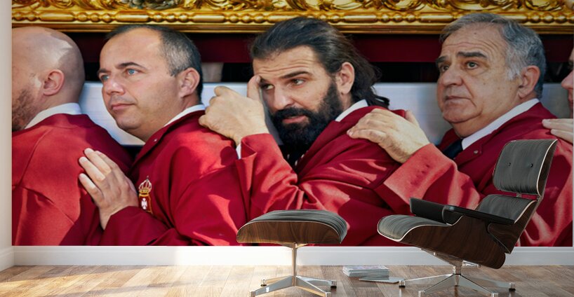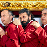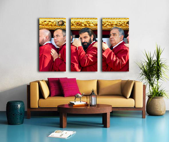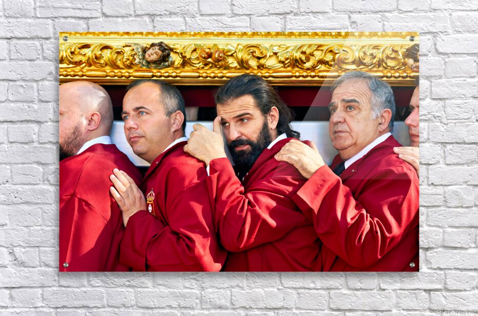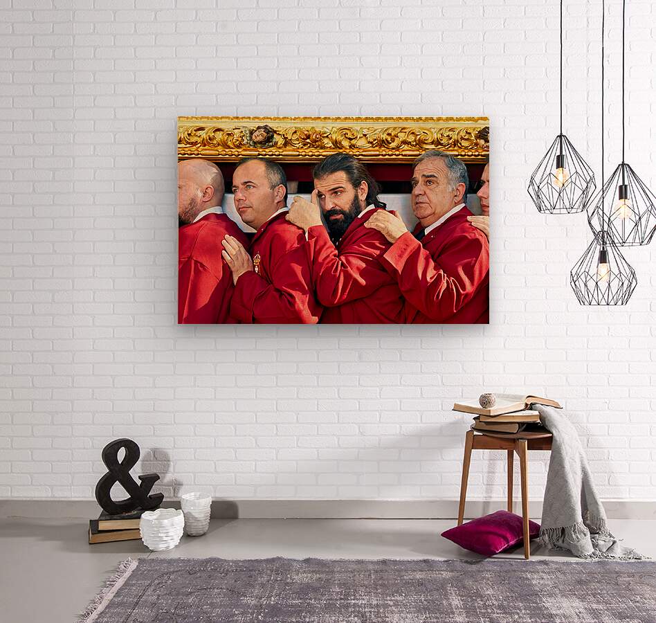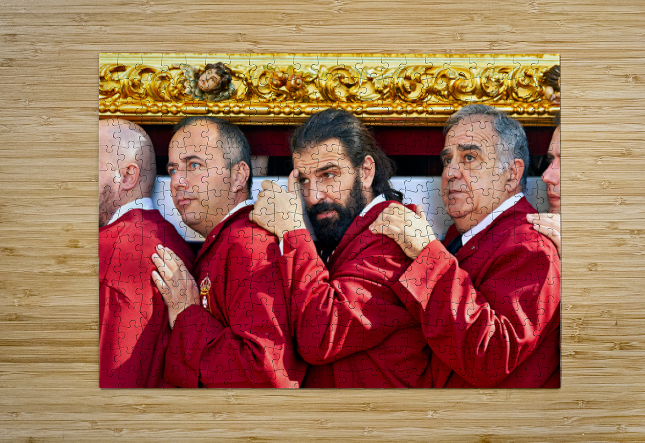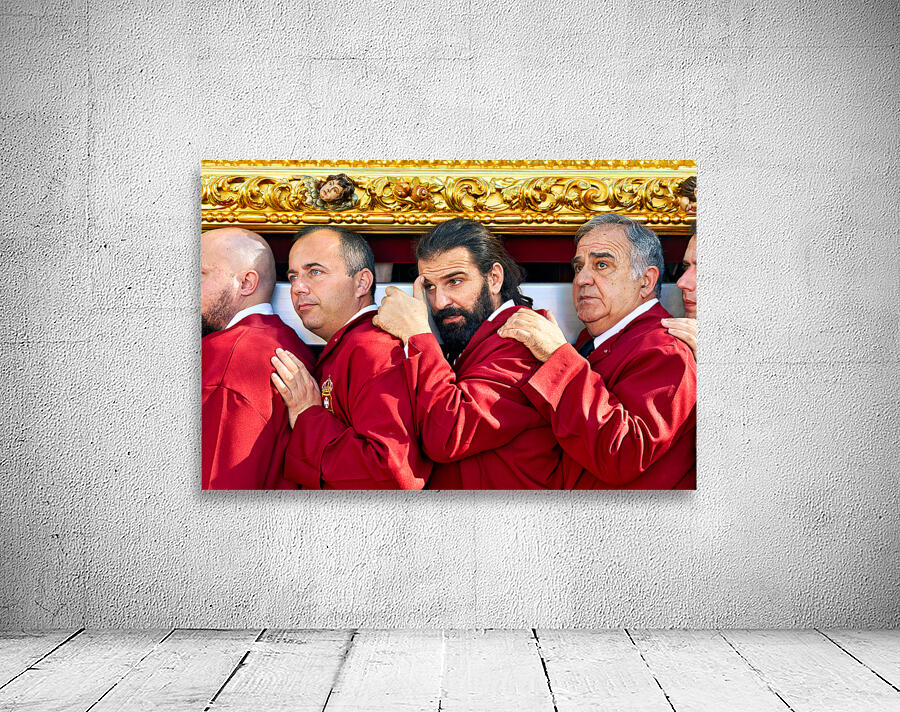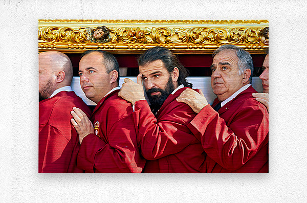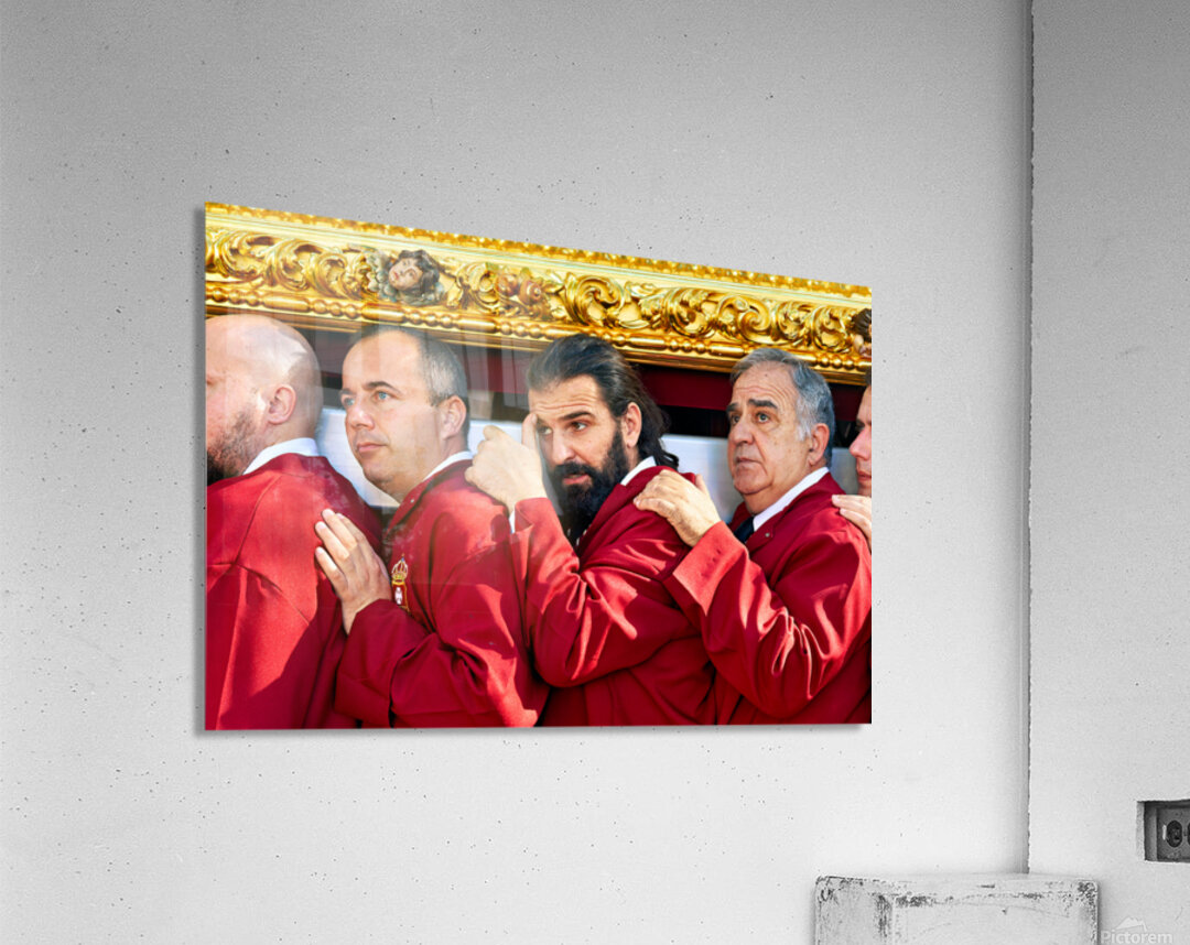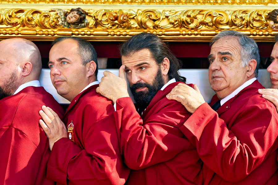 Men carry a religious float during processions in Malaga Spain. This event marks the celebration of Easter Holy Week each year.