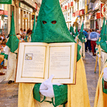 Participants march in the streets of Malaga holding religious symbols. This event occurs during Holy Week leading up to Easter.
