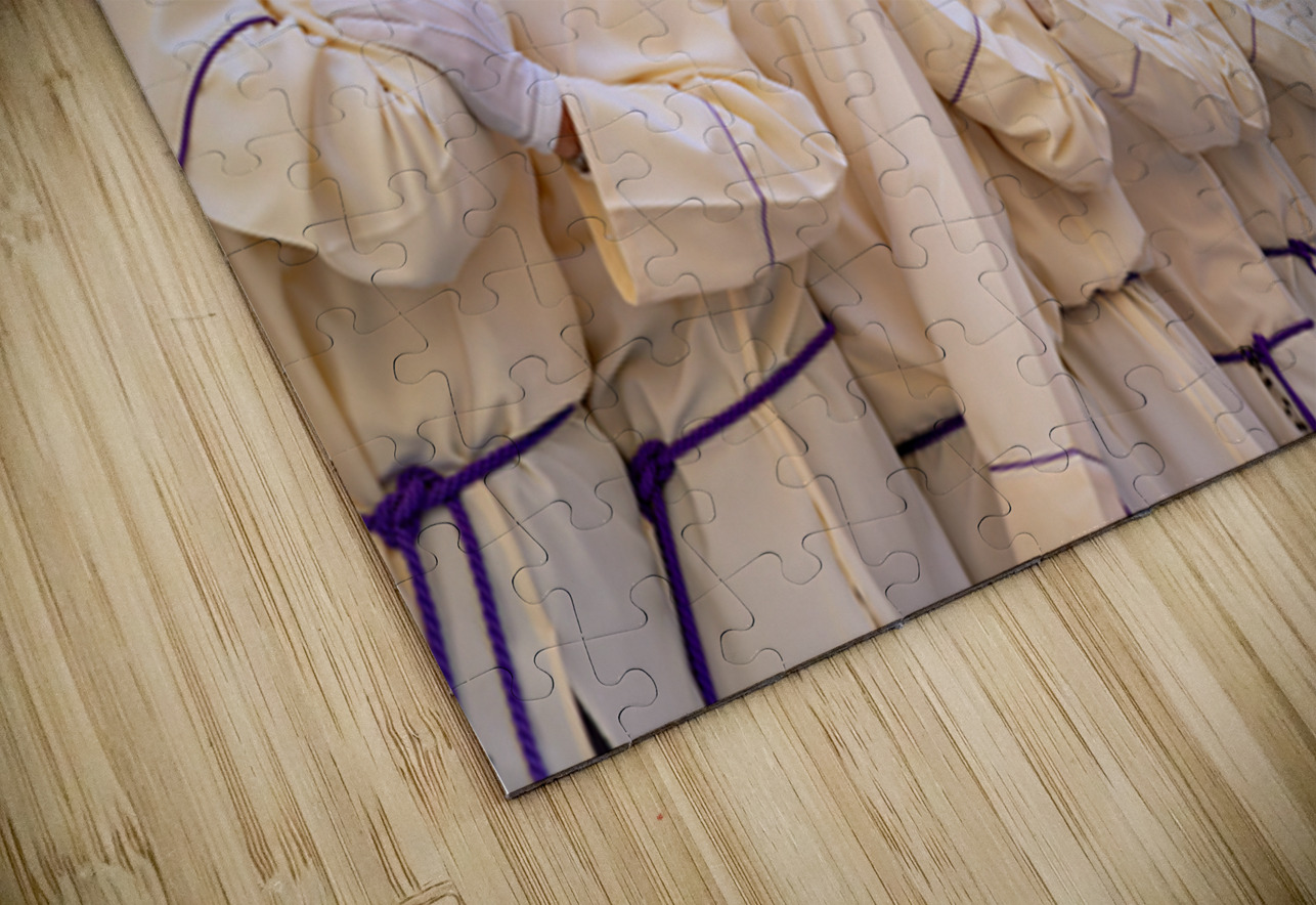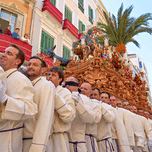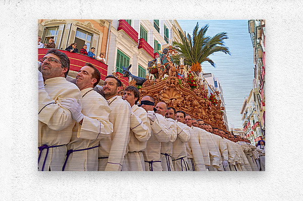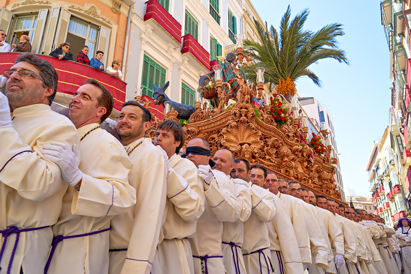 People participate in a procession in Malaga Spain during Easter Holy Week. Many carry a large float through the streets.
