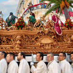 People participate in processions for Easter Holy Week in Malaga Spain. They carry ornate wooden floats through the streets.