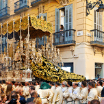 Large religious float moves through streets of Malaga during Easter Holy Week. Many people watch and participate in the procession.
