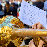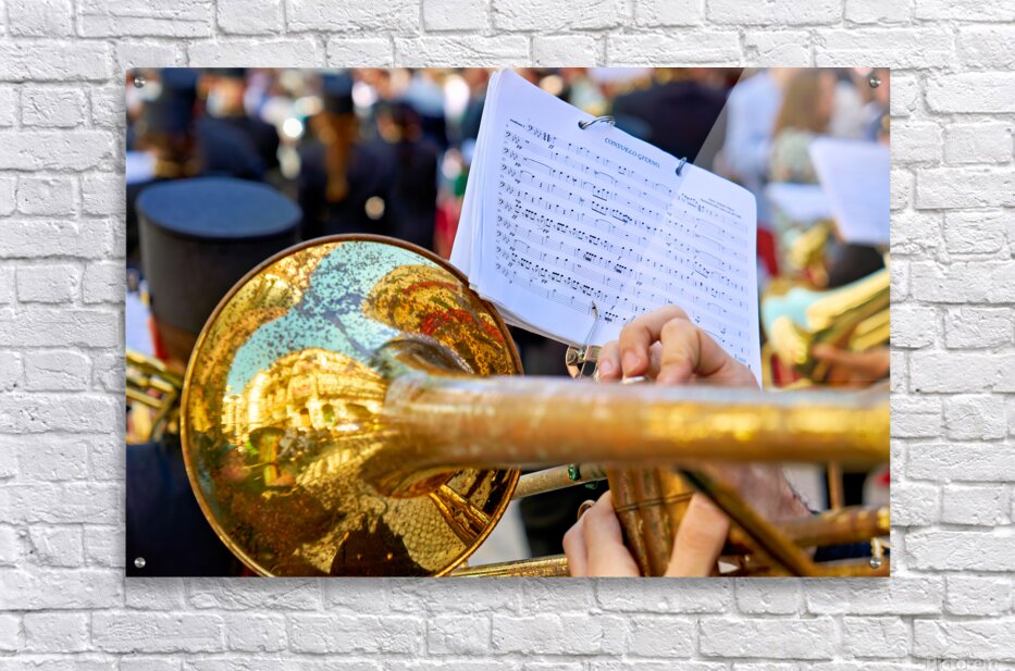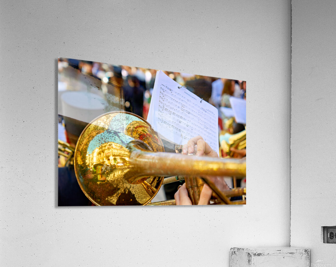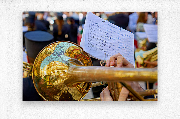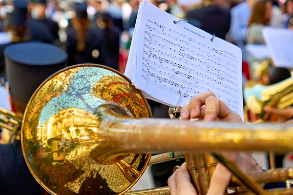 Musicians play brass instruments while a procession takes place for Easter Holy Week in Malaga Andalusia. The scene is lively and festive.