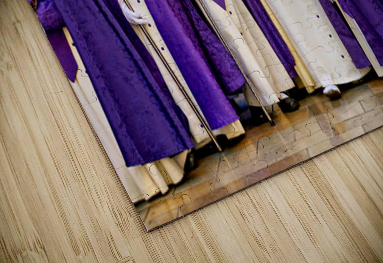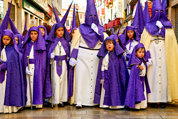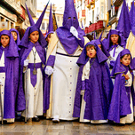People in purple robes walk together during Easter Holy Week processions in Malaga Andalusia. This event marks important traditions.