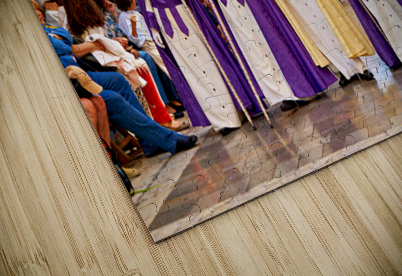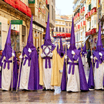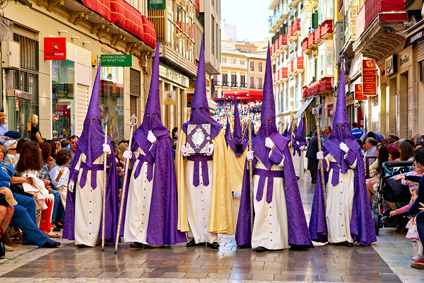 People walk in processions for Easter Holy Week in Malaga Spain. Participants wear purple robes and carry religious icons through the streets.