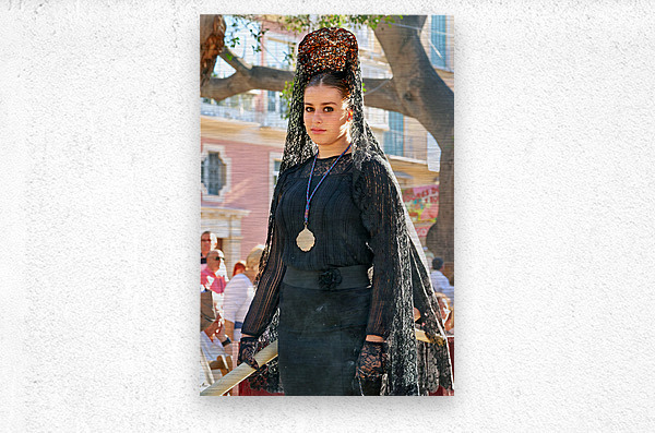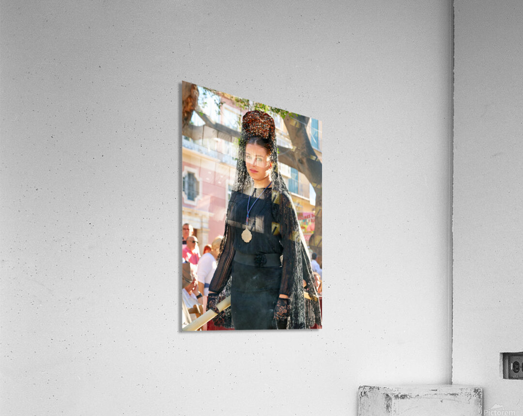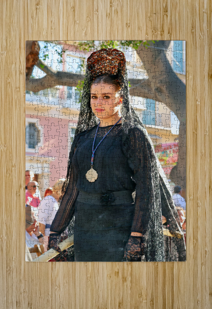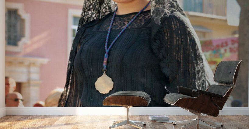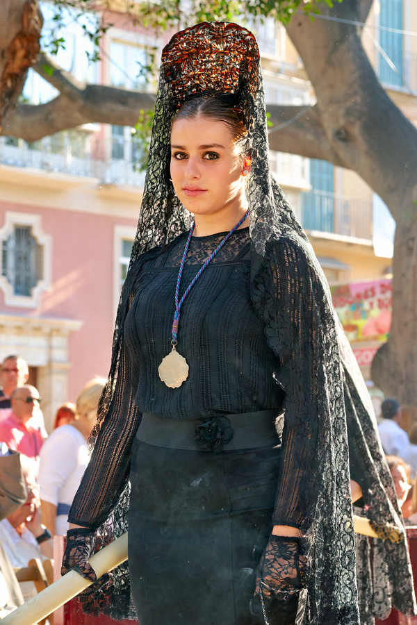 People gather in Malaga for Holy Week processions. A woman in black walks with a procession showing local culture and tradition.