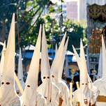 People walk in a procession wearing white robes and cone hats. This event takes place in Malaga Spain during Easter Holy Week.