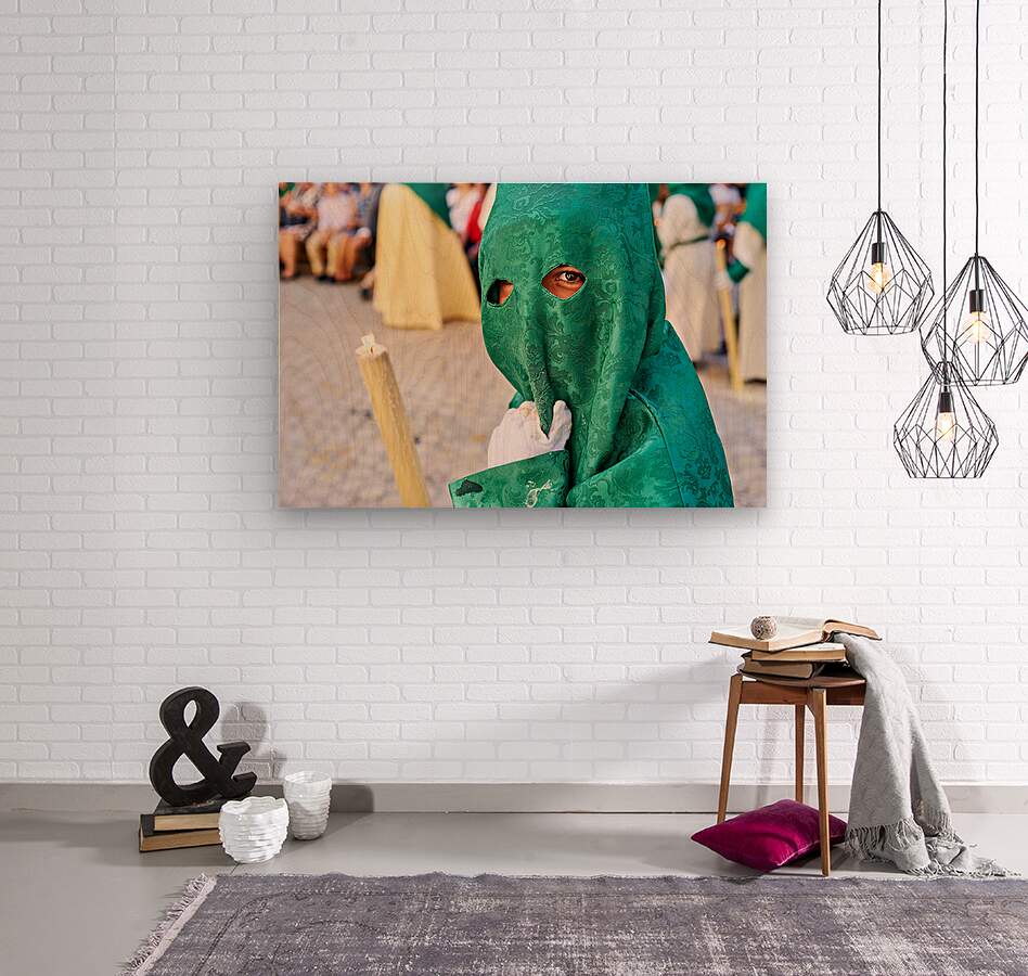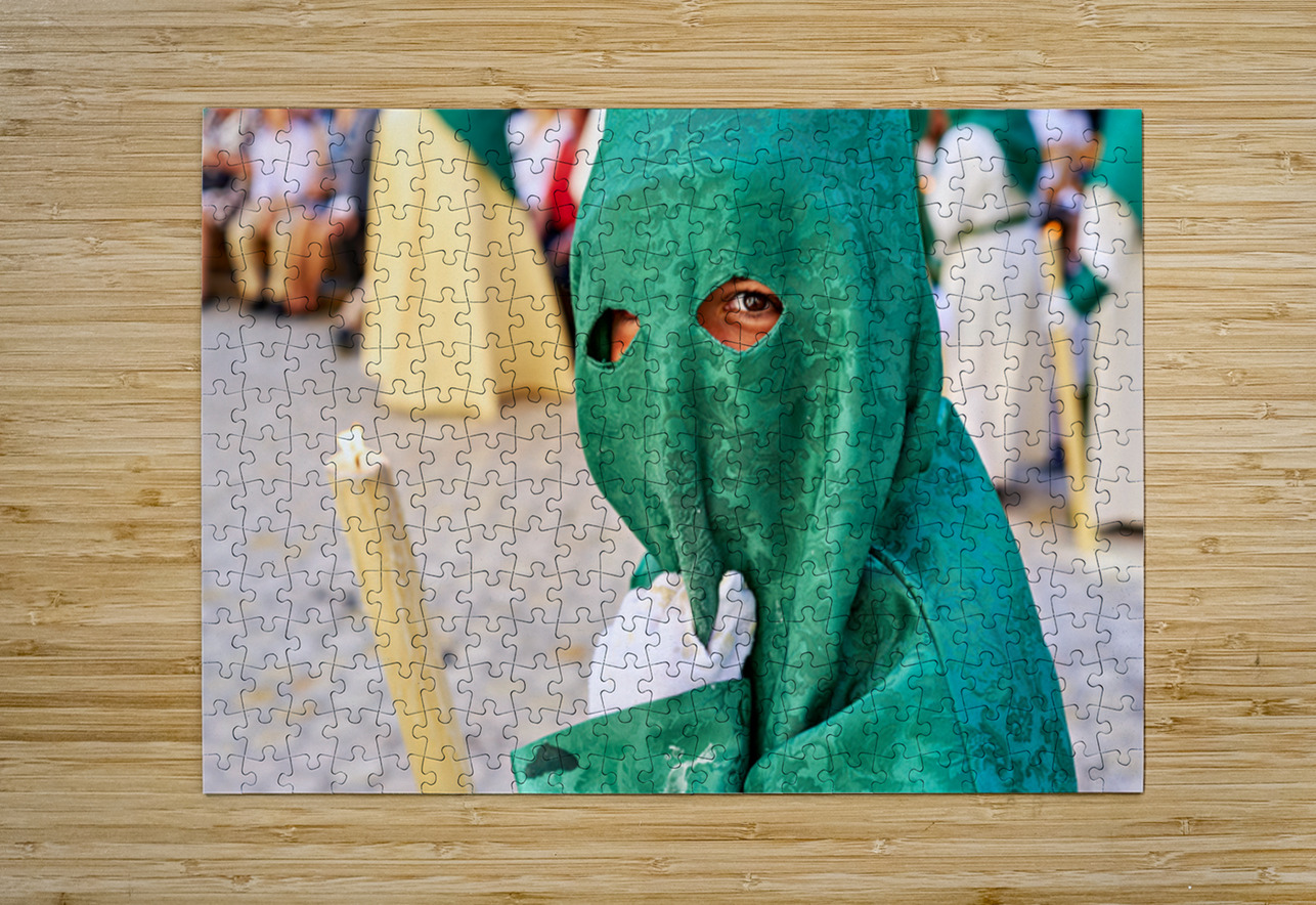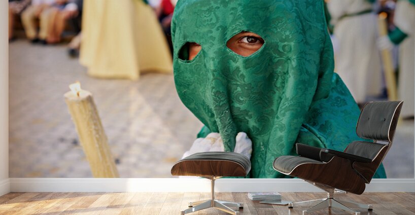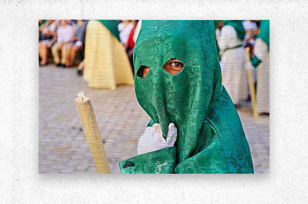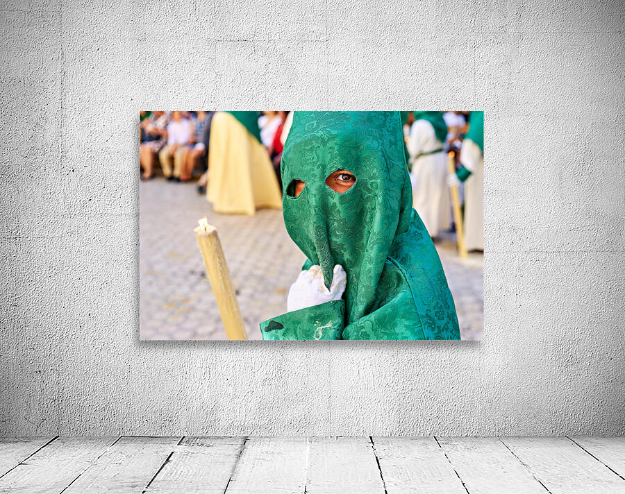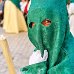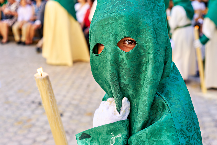People gather in Malaga Spain for Easter Holy Week processions. A boy in a green robe holds a candle and waits for the event to start.