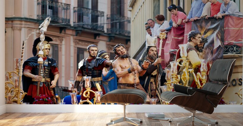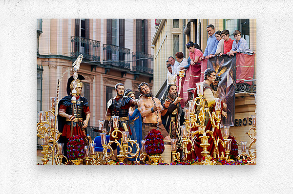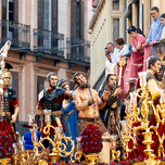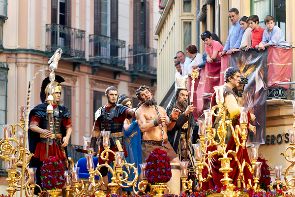 The procession shows religious figures and participants in costumes moving through the streets of Malaga during Easter Holy Week.