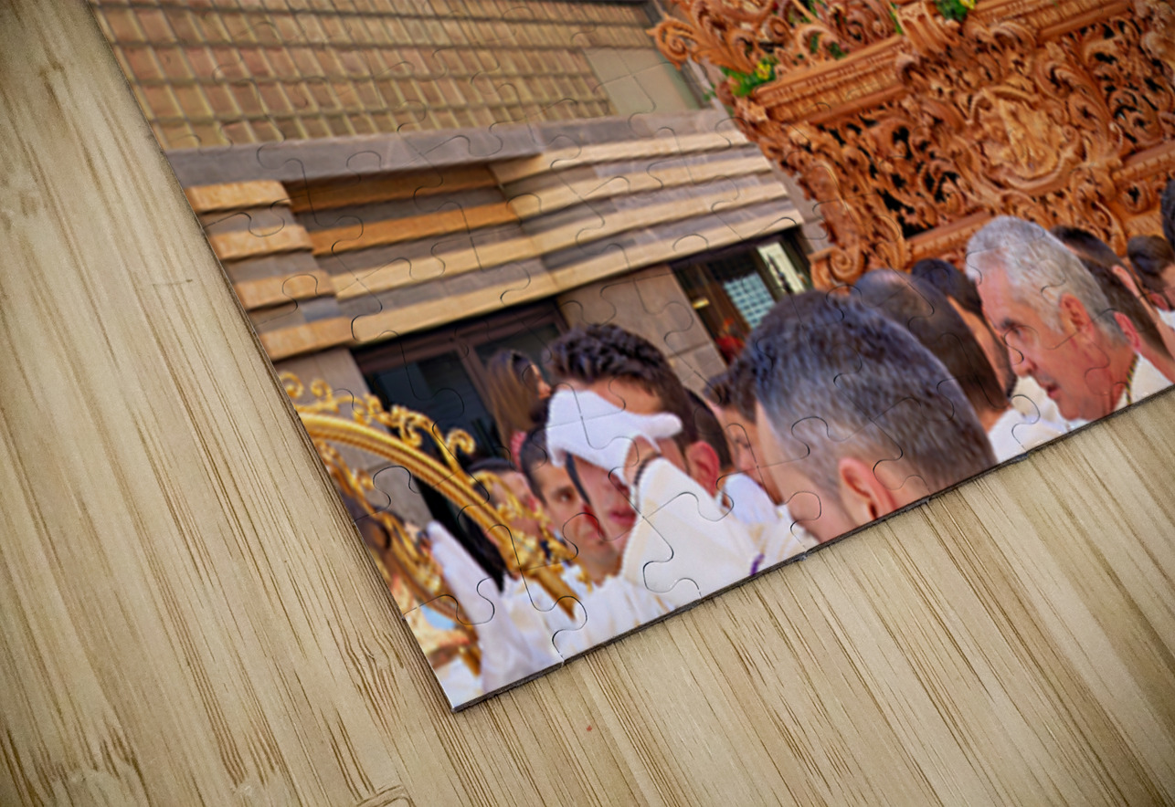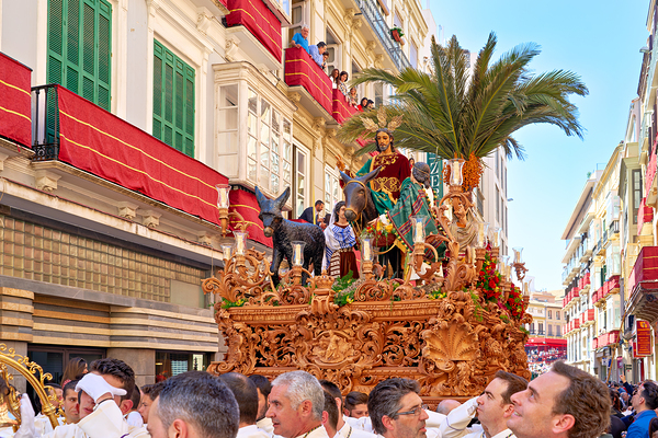 People march through the streets of Malaga during Easter Holy Week. They carry a decorated float with a figure.