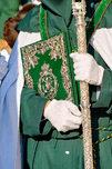 During Easter Holy Week in Granada people participate in processions. A figure holds a book and a staff while dressed in a robe.