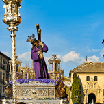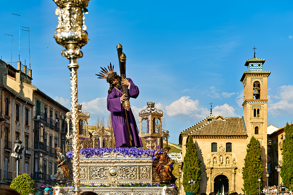 Crowds gather in Granada during Easter Holy Week to watch processions with religious statues. People honor traditions in the streets.