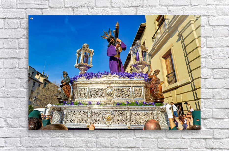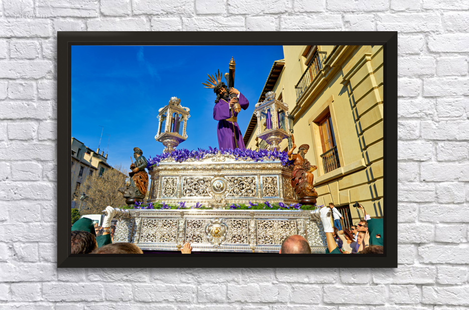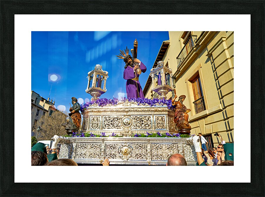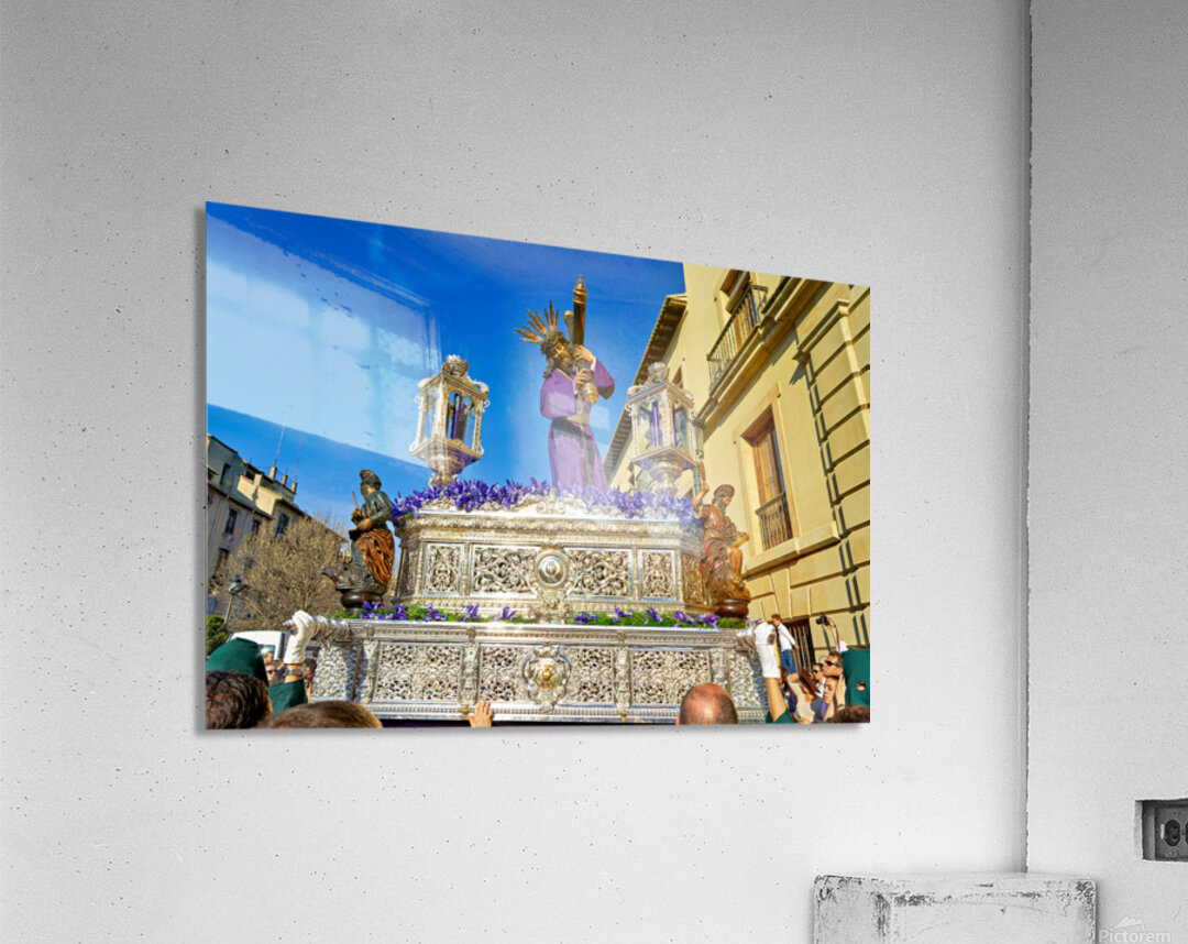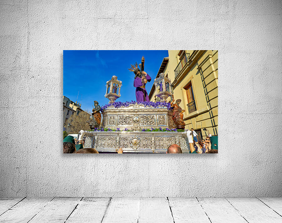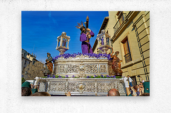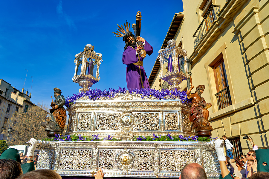 In Granada people carry a large float with a statue during the Easter Holy Week processions. The sun shines on the crowds as they walk.