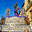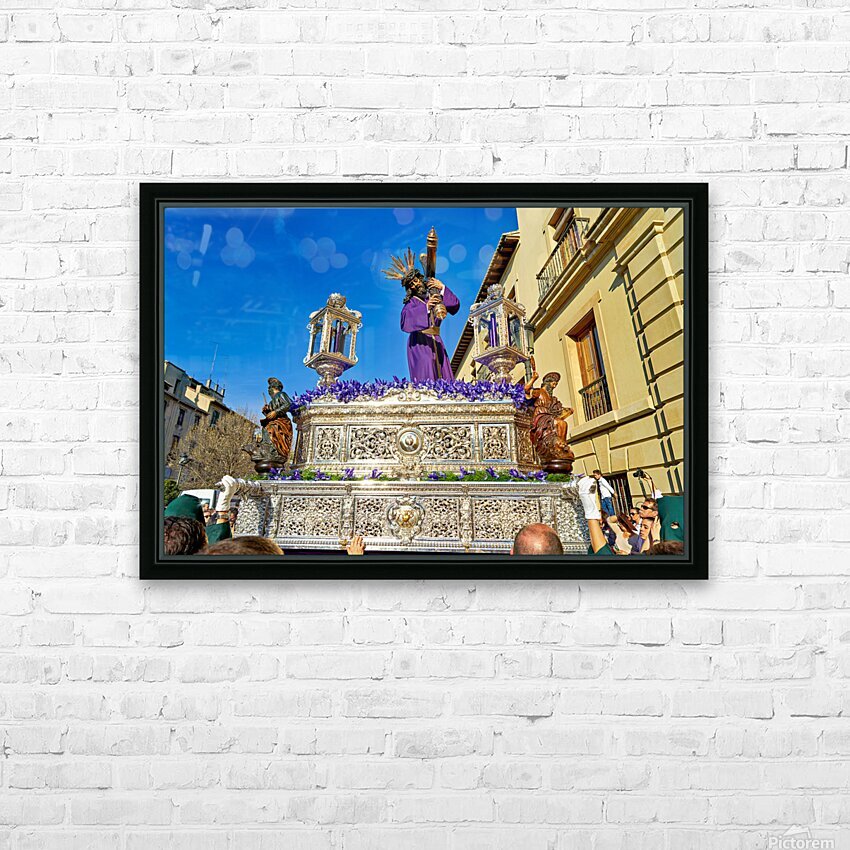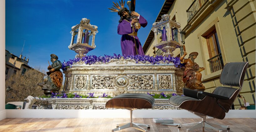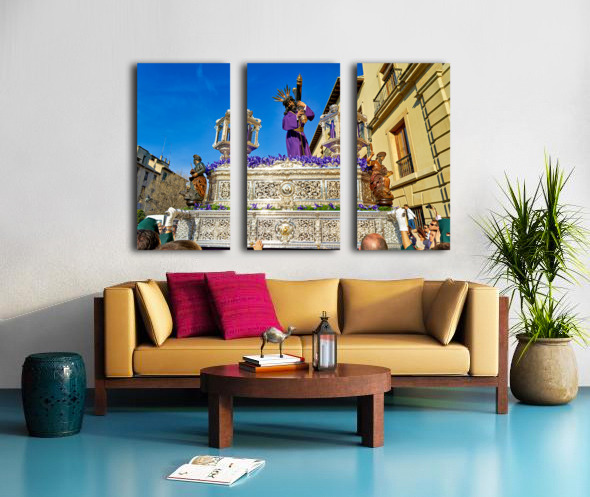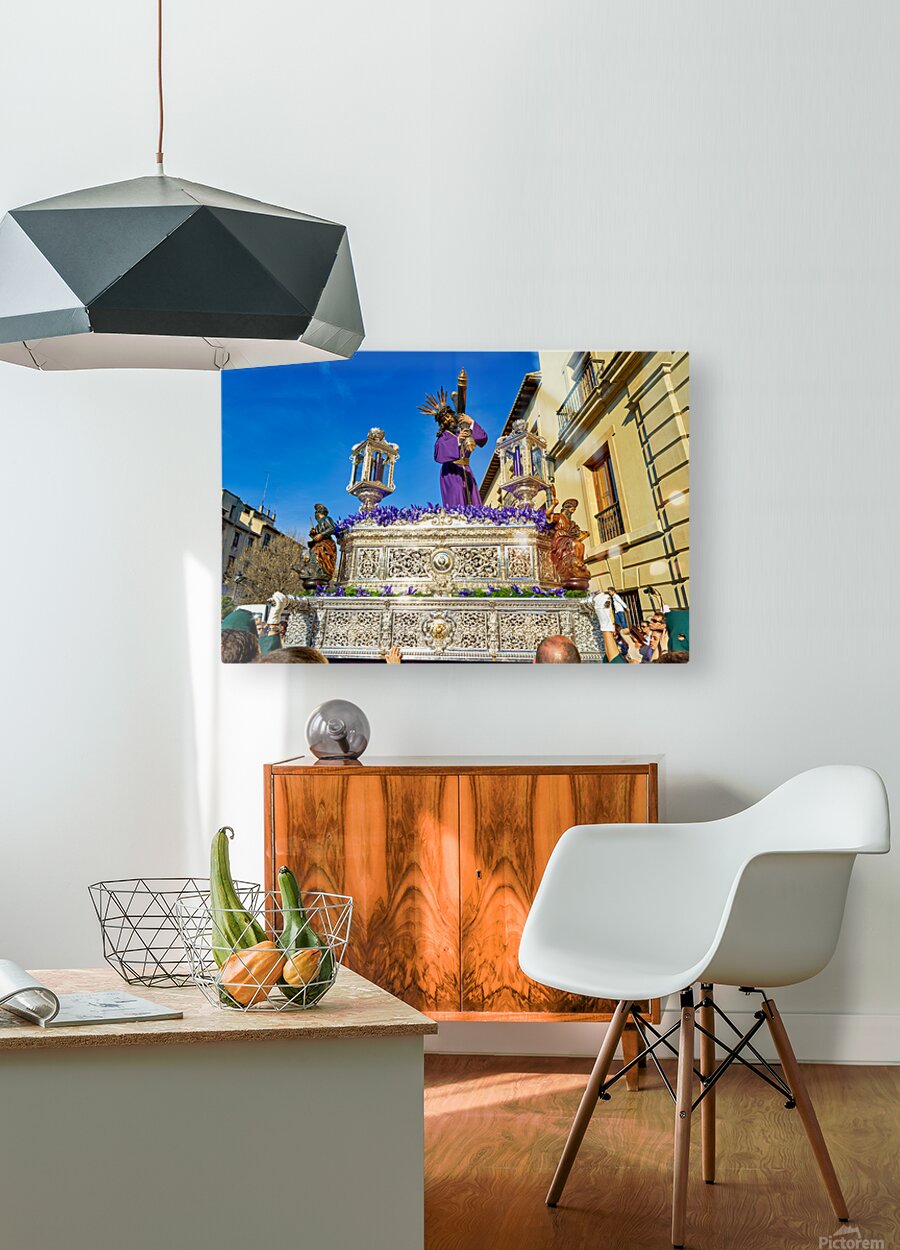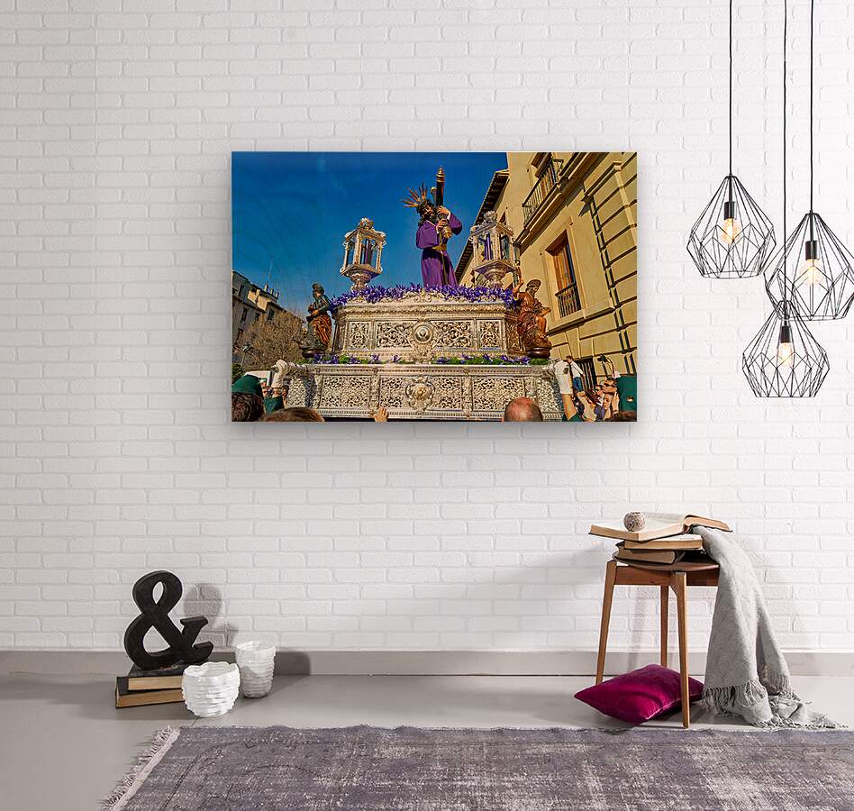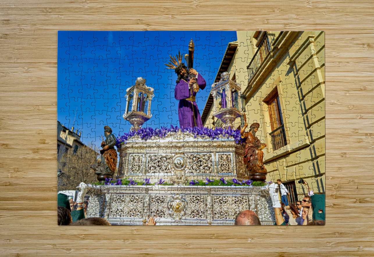 In Granada people carry a large float with a statue during the Easter Holy Week processions. The sun shines on the crowds as they walk.