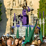 People gather in Granada for the Easter Holy Week procession. A statue of Jesus can be seen on a float surrounded by green flags.
