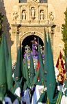 Crowds gather in Granada as processions take place for Easter Holy Week. Participants wear traditional robes and carry religious symbols.