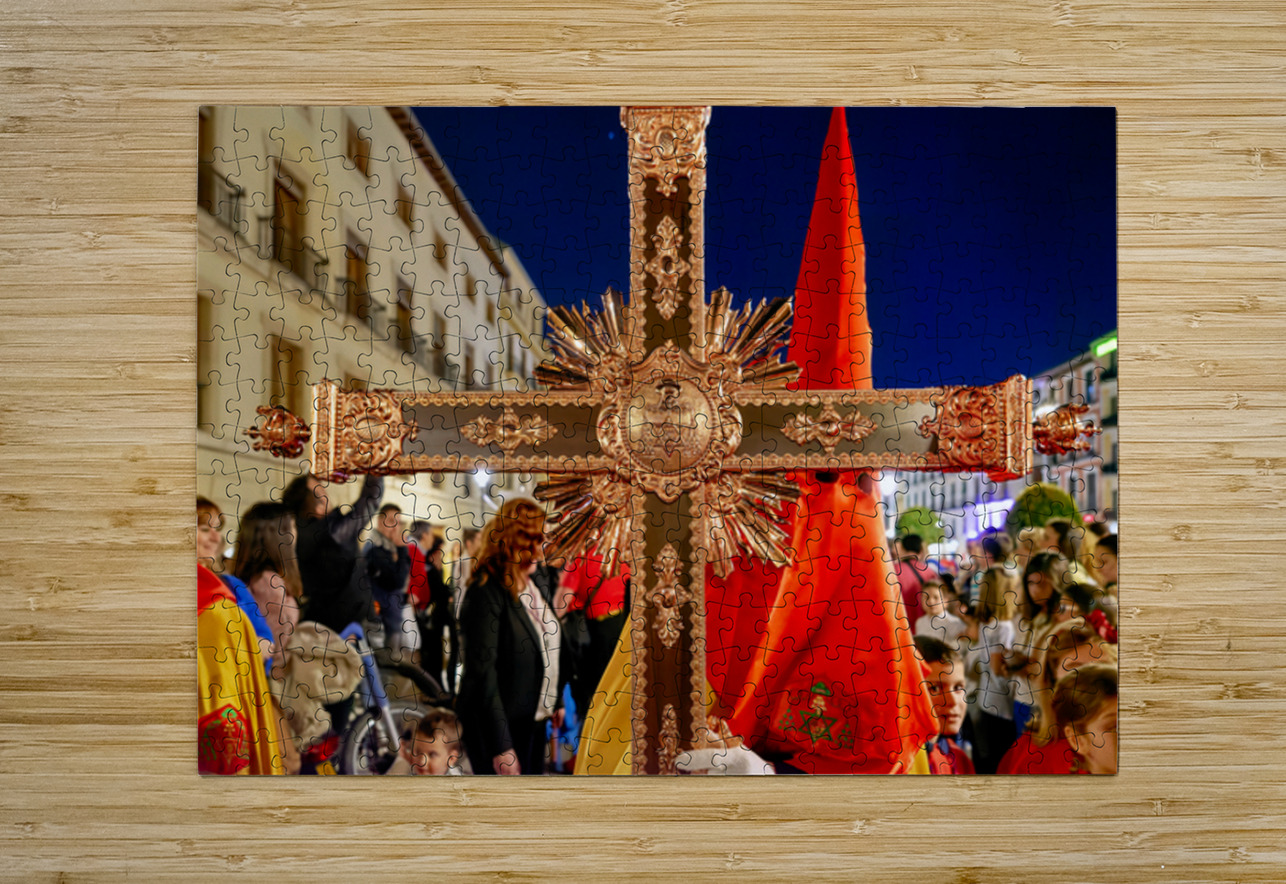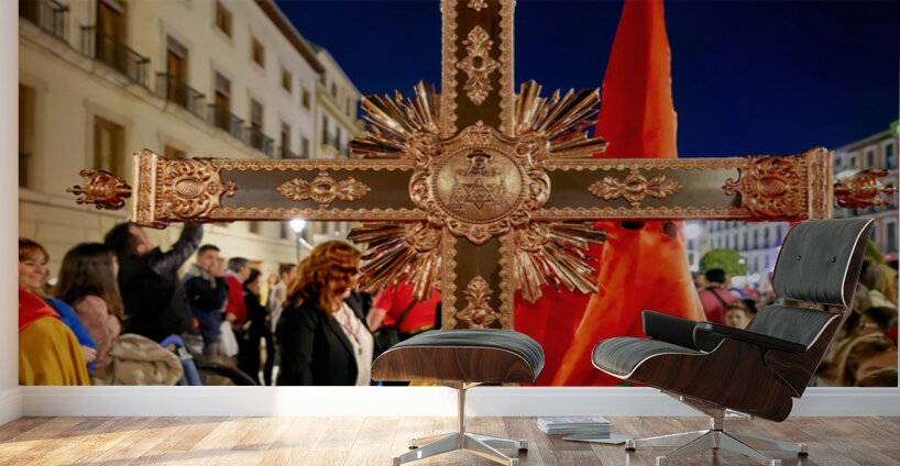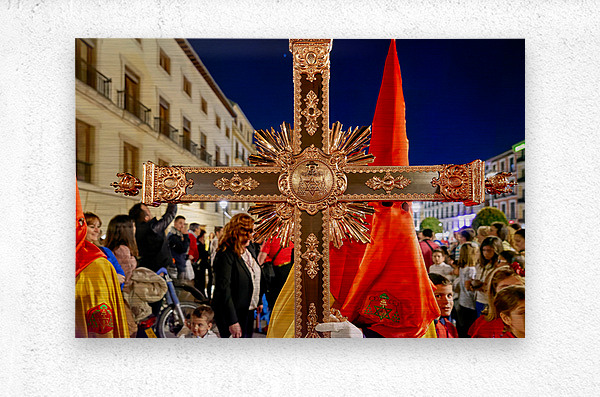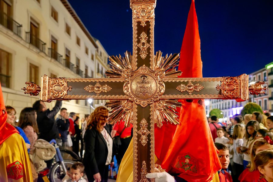People gather in Granada Spain during Easter Holy Week. They hold a large cross and participate in the traditional procession at night.
