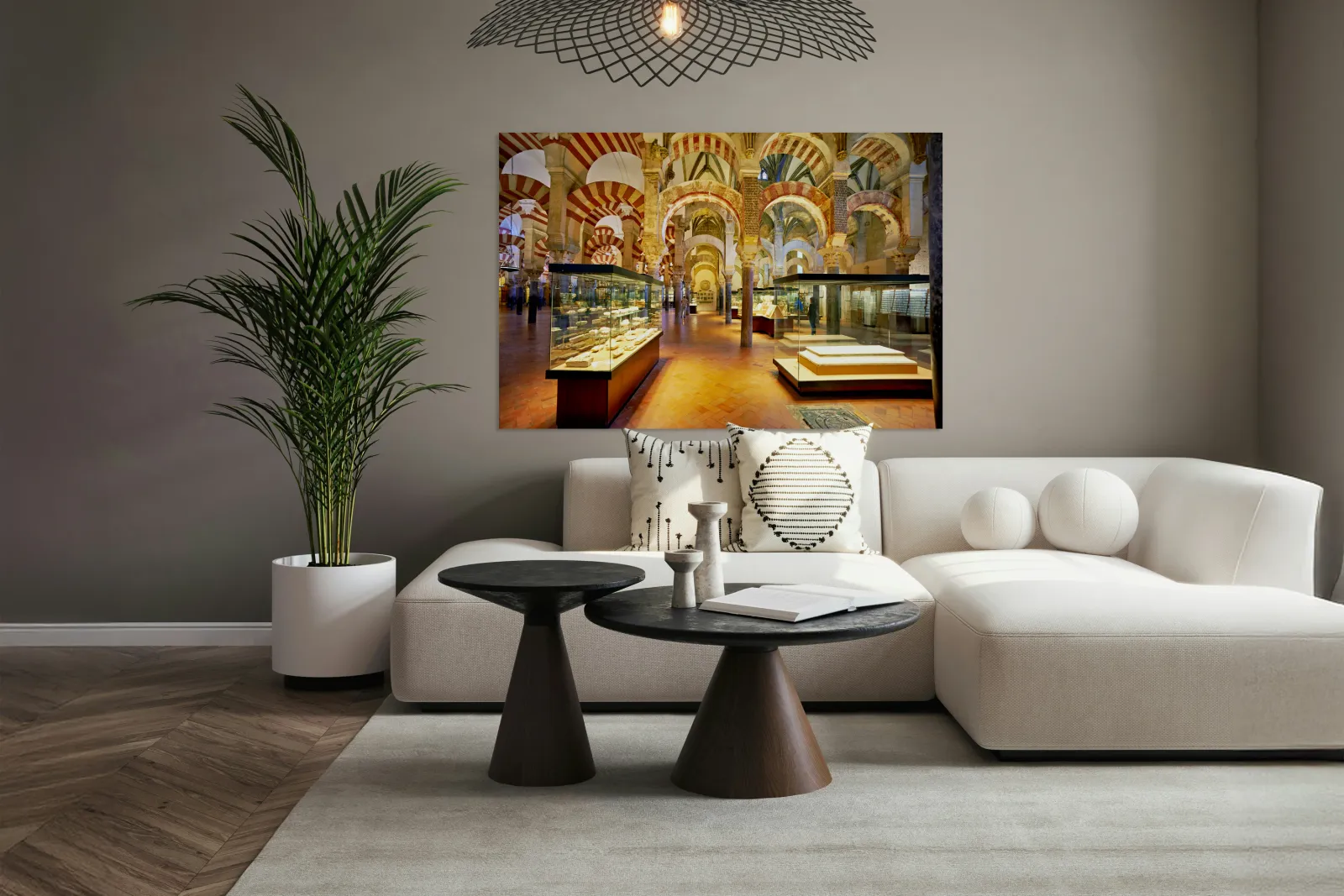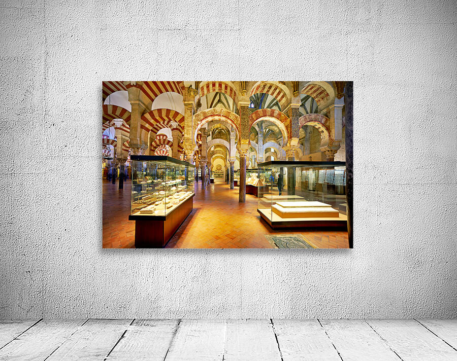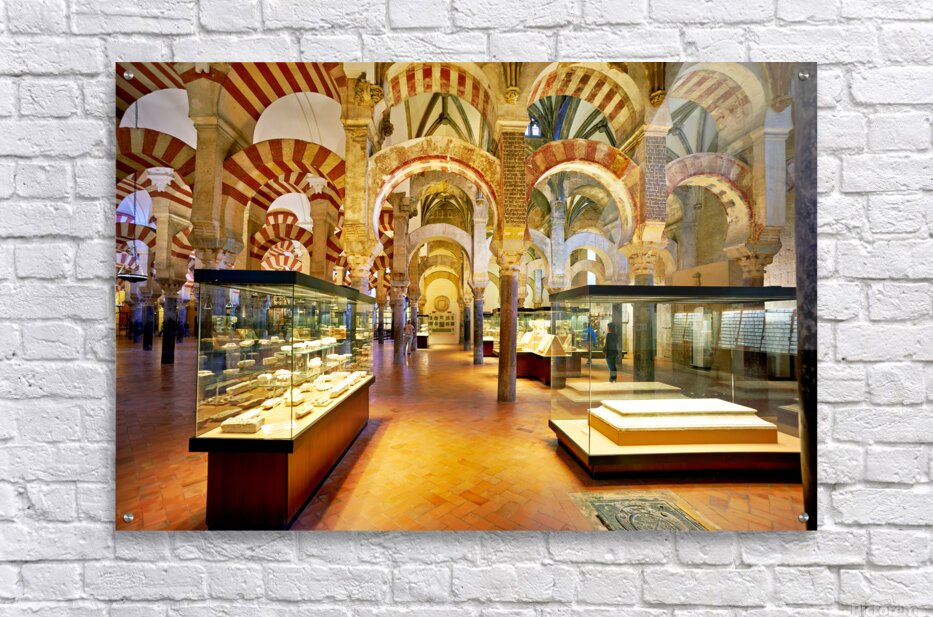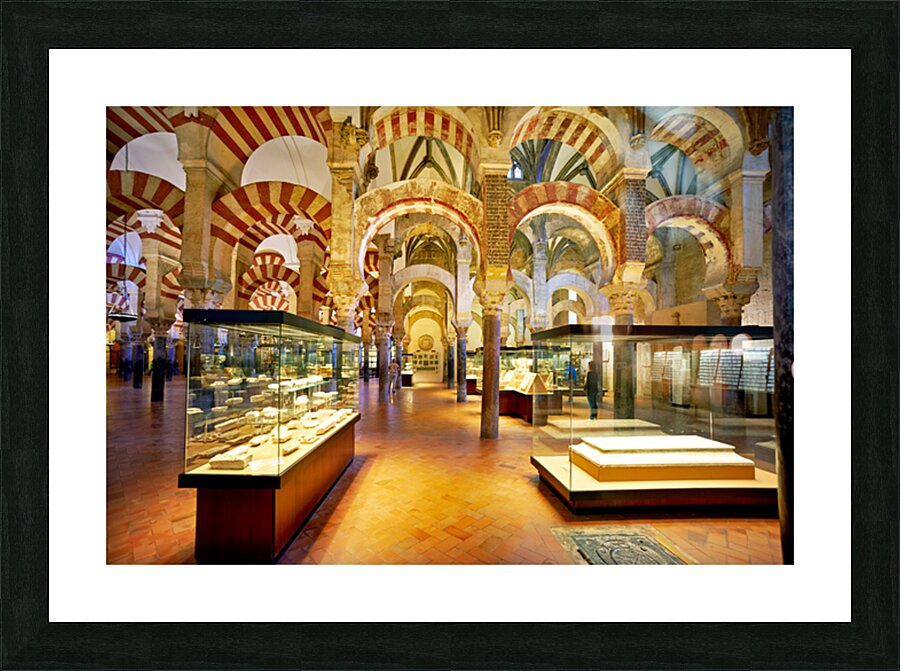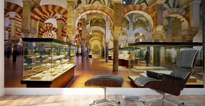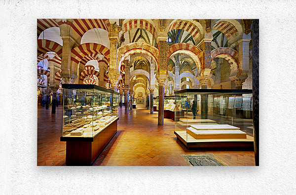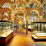 Visitors walk through the Mosque-Cathedral in Cordoba observing displays of artifacts and intricate arches in the historical site.