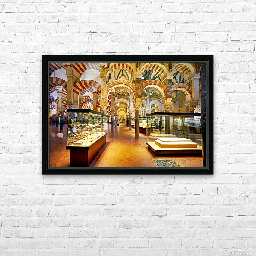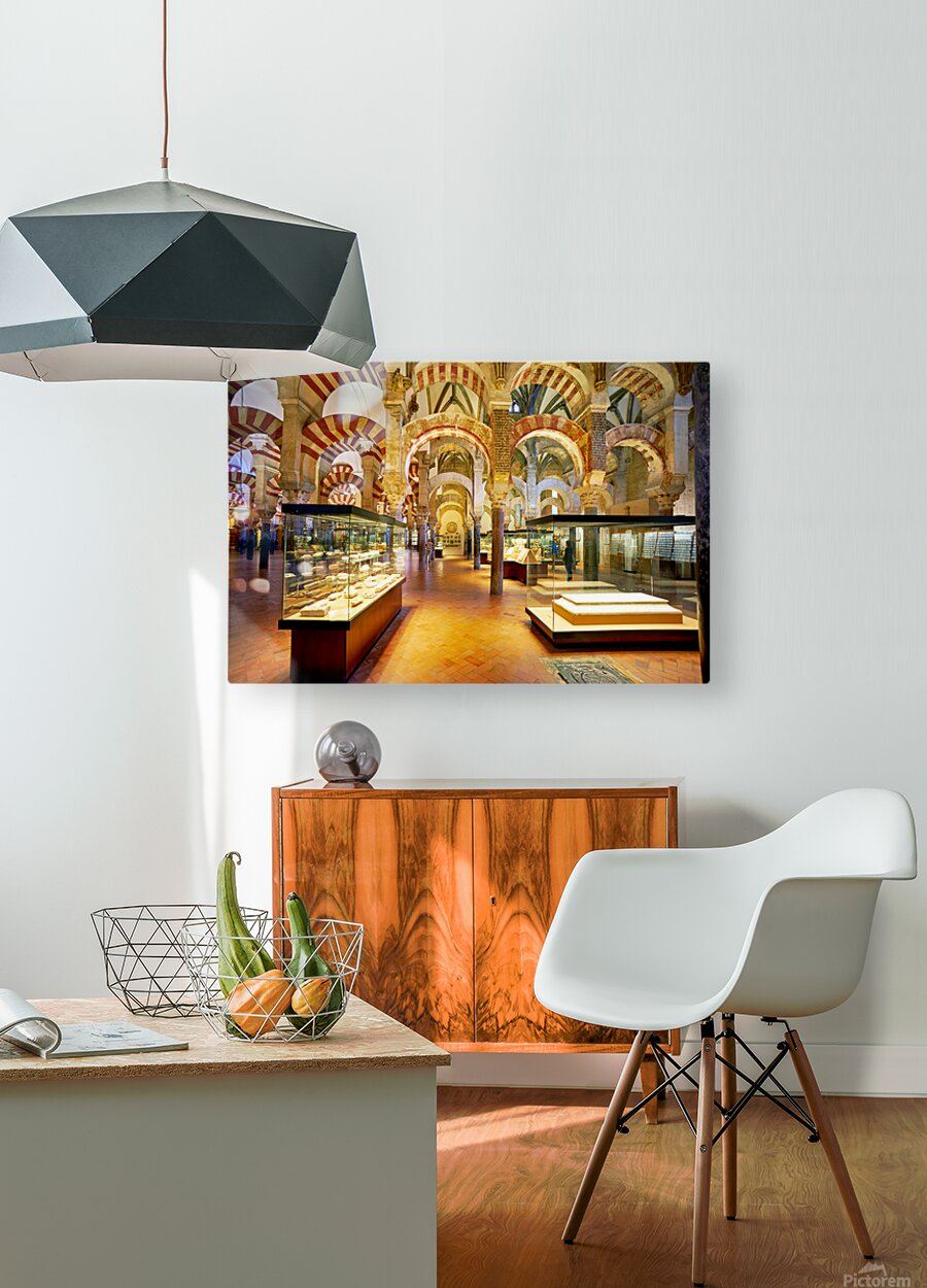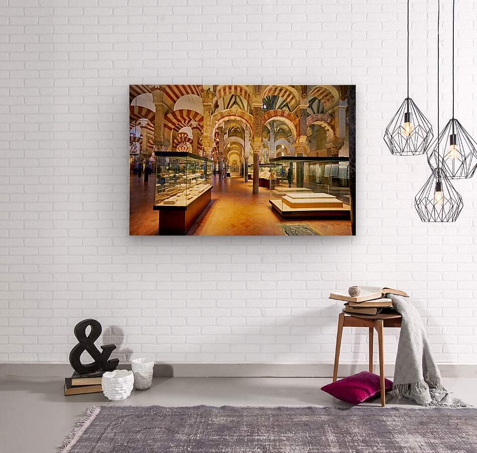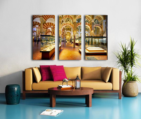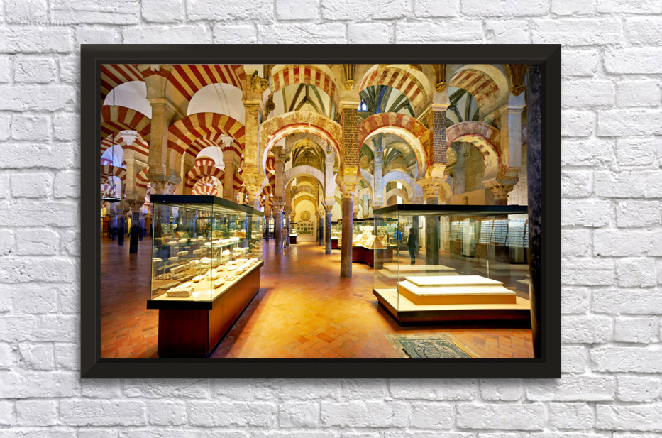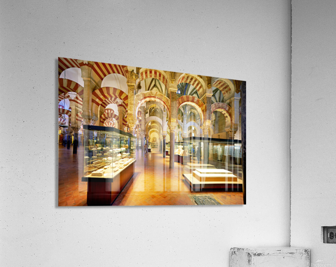 Visitors walk through the Mosque-Cathedral in Cordoba observing displays of artifacts and intricate arches in the historical site.