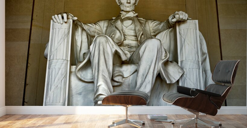 Abraham Lincoln statue sits inside Lincoln Memorial in Washington D.C. The large statue shows Lincoln seated with hands resting on his legs.
