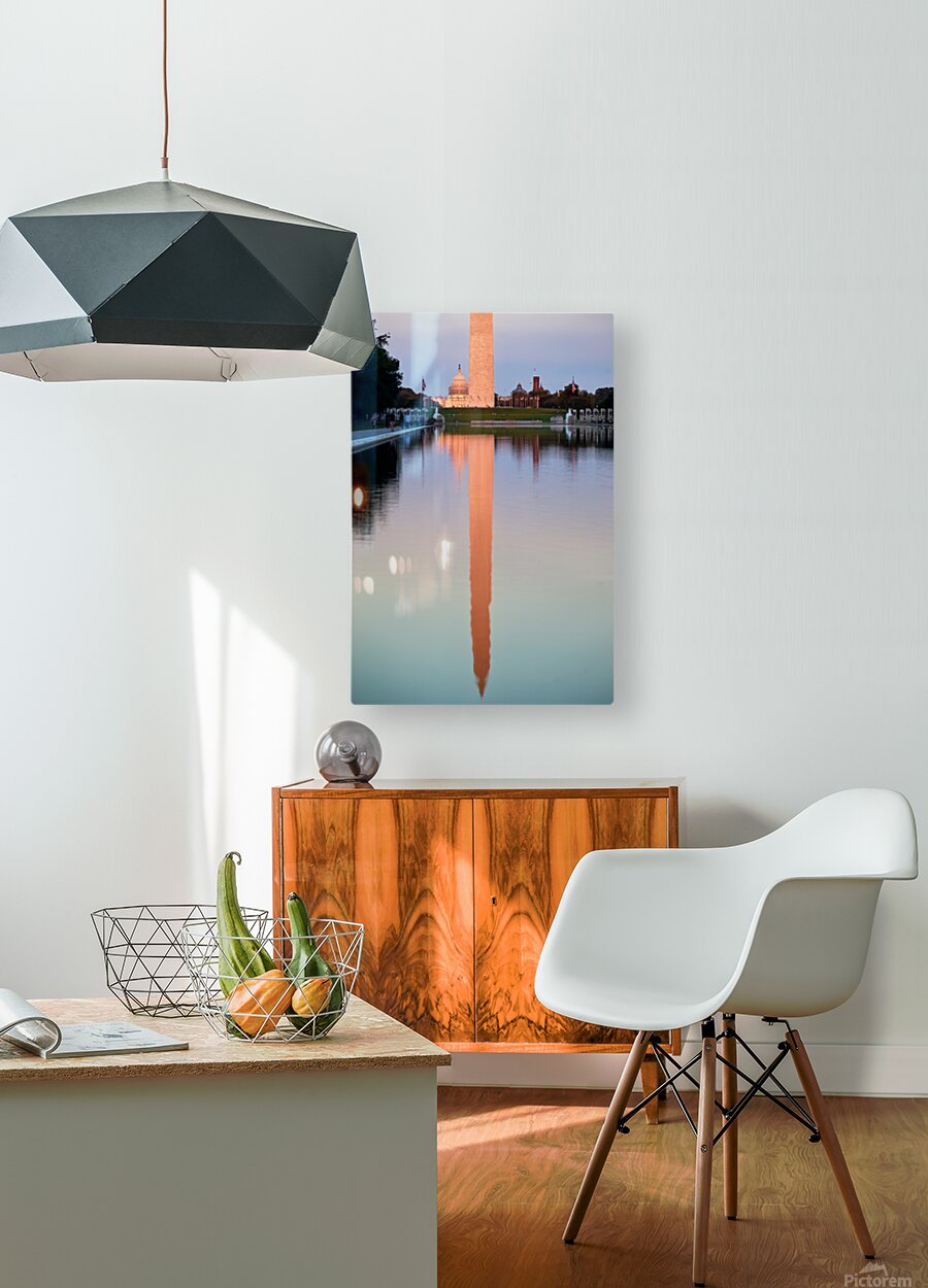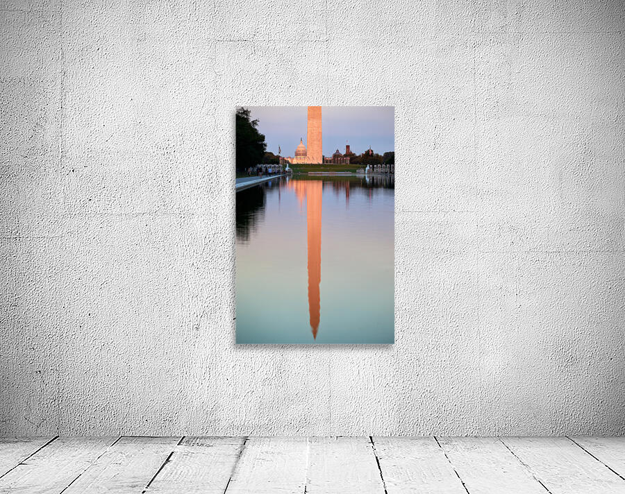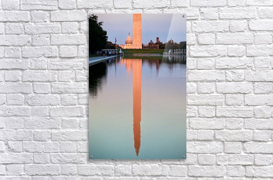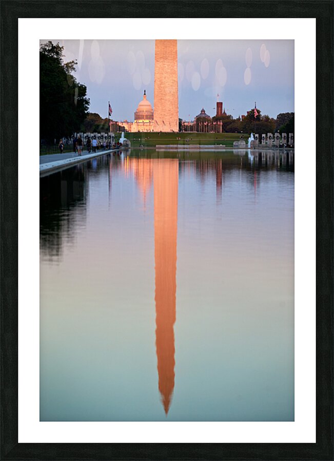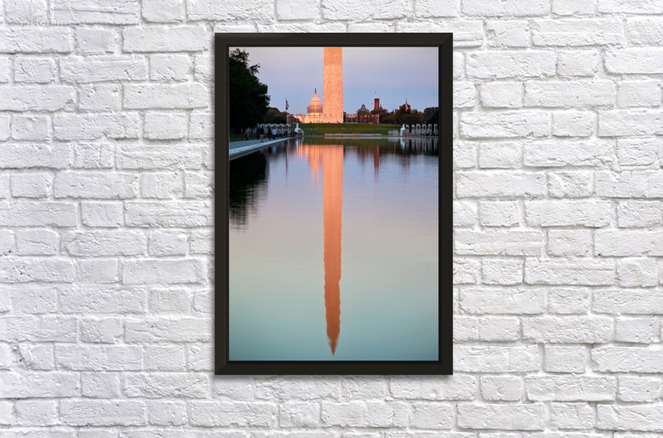 "Sunset view of Washington Monument and Capitol building" in a framed print.
