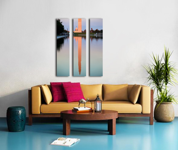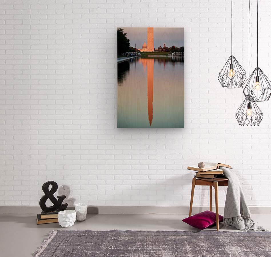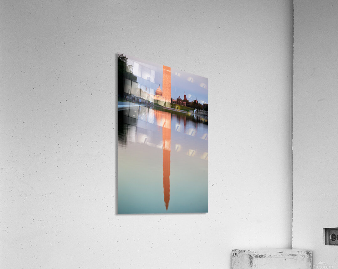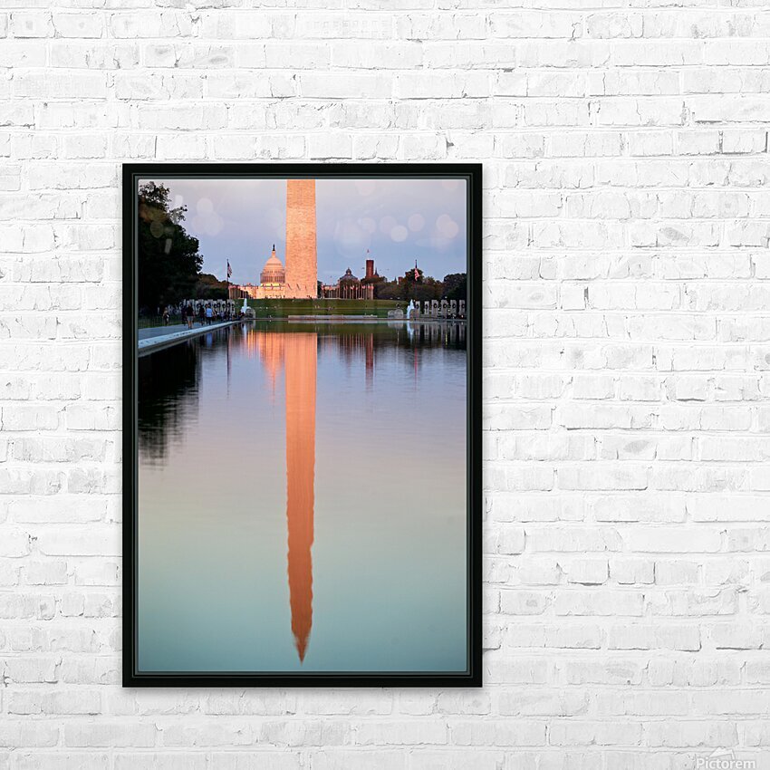 "Sunset view of Washington Monument and Capitol building" in a framed print.