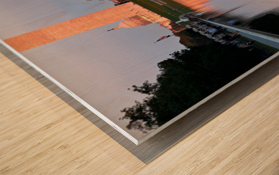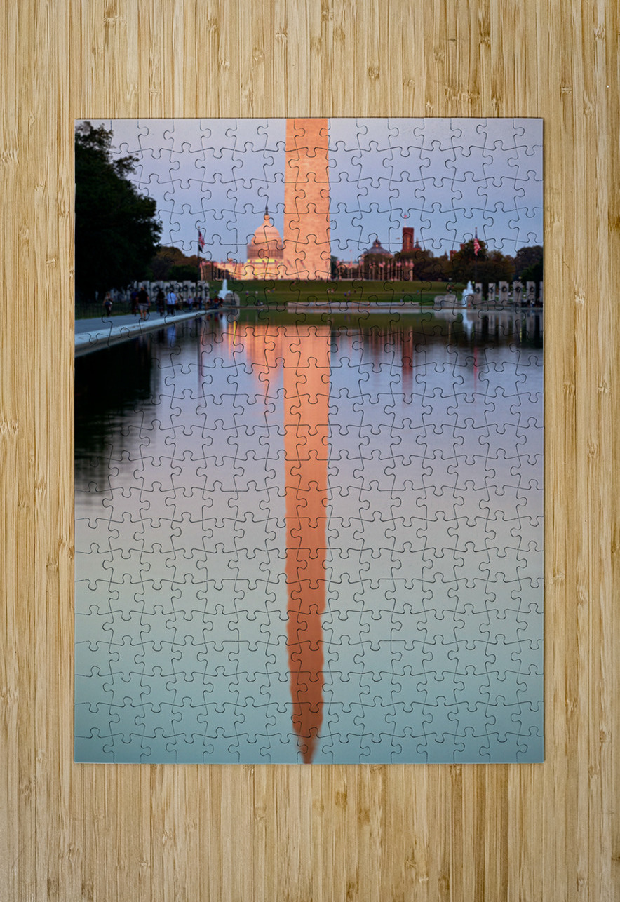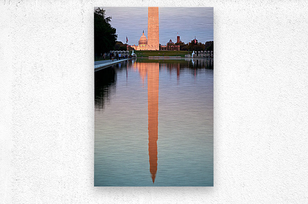 Sunset shows Washington Monument and Capitol building reflected in Lincoln Memorial Pool in Washington D.C. Visitors enjoy the scene.