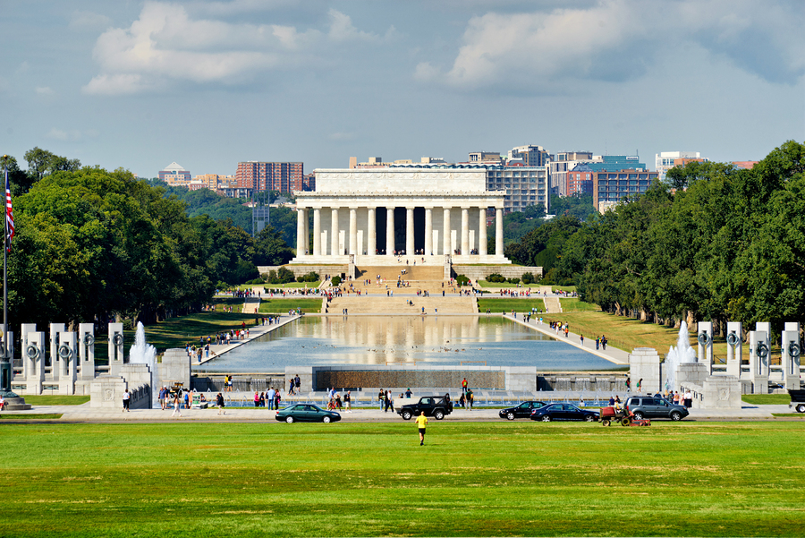 Visitors walk around the Lincoln Memorial and its reflecting pool while enjoying a sunny day in Washington D.C. at the National Mall.