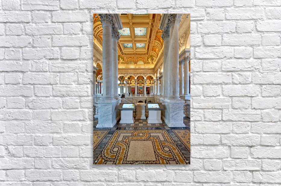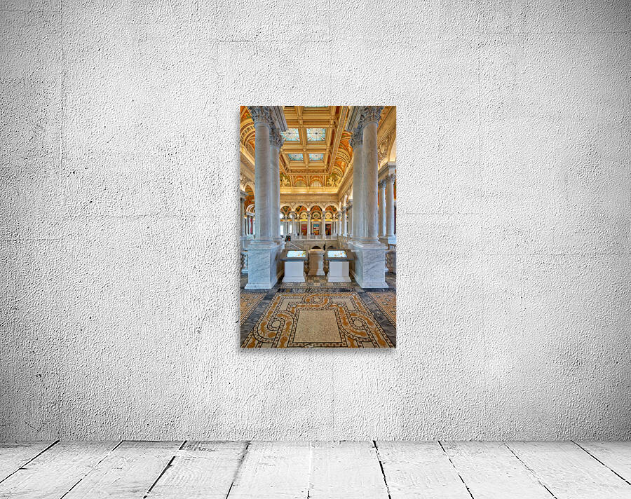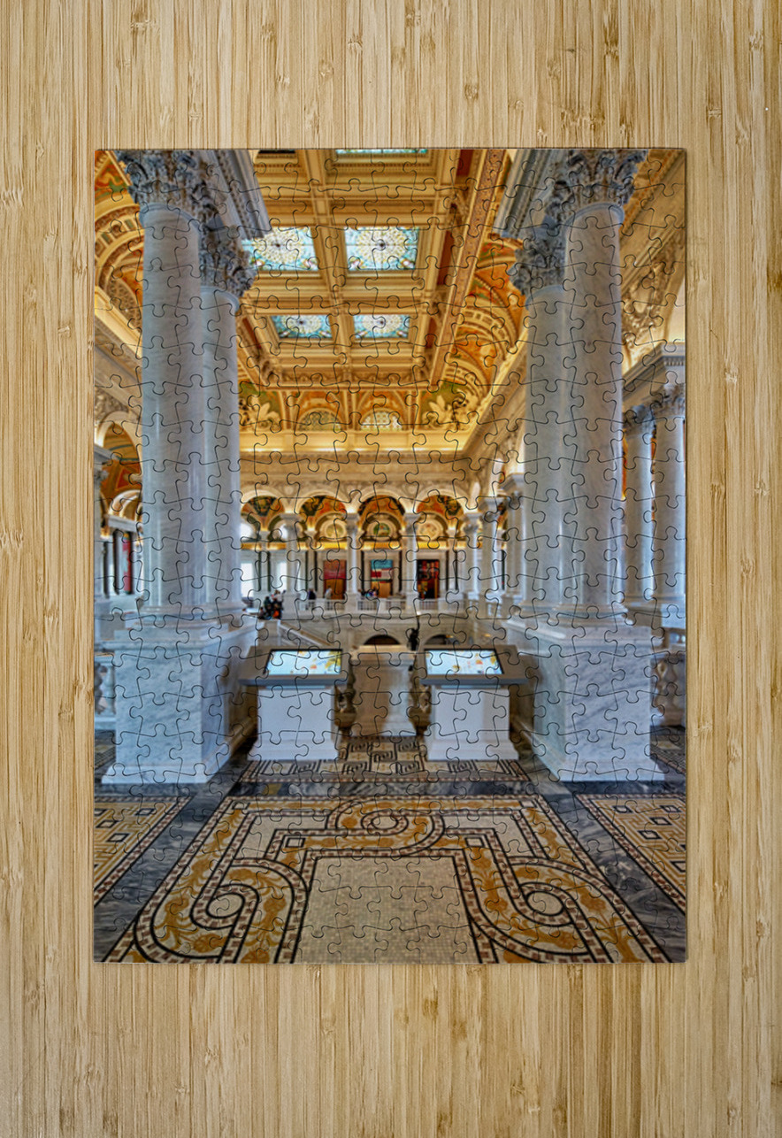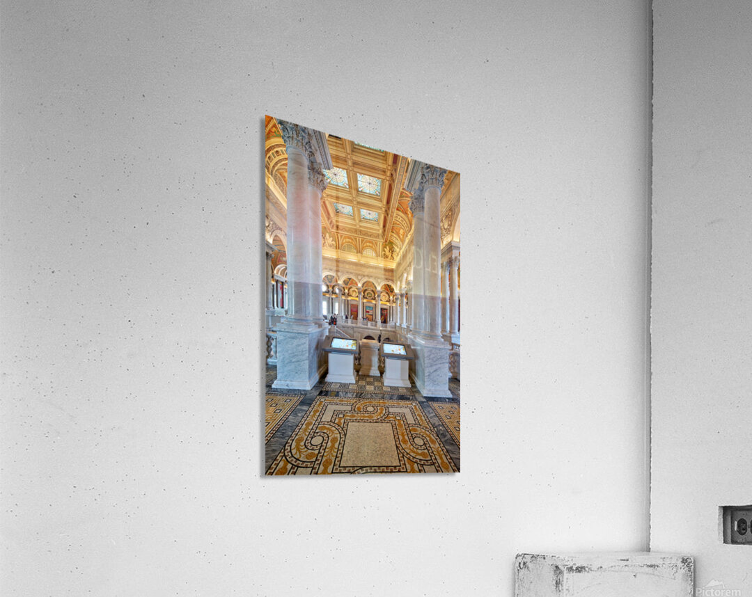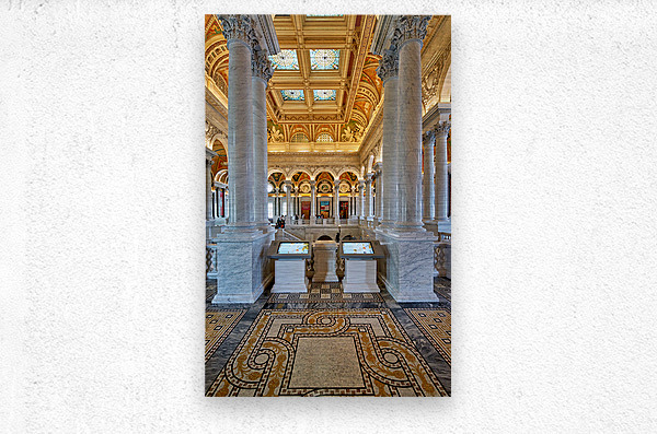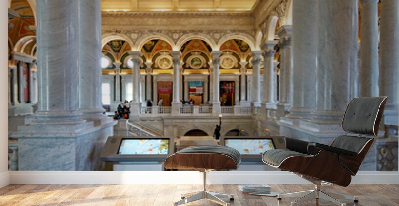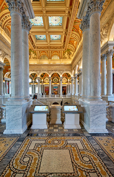 People walk through the Library of Congress in Washington D.C. The beautiful architecture and displays draw visitors inside.