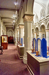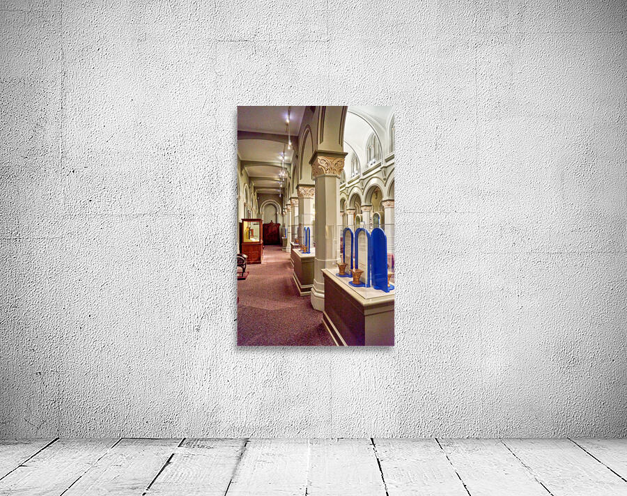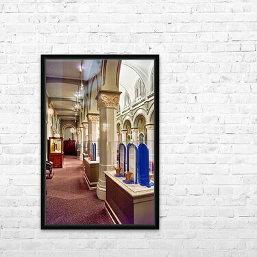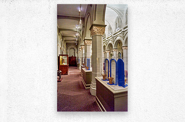 Visitors walk through the halls of the Smithsonian Institution in Washington D.C. and view various displays and artifacts inside.