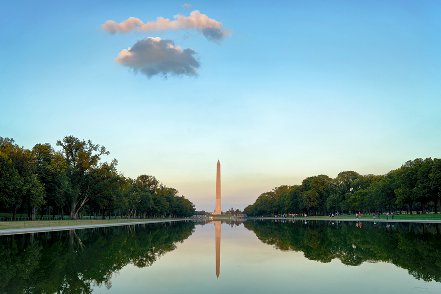 The Washington Monument stands tall at sunset reflected in the Lincoln Memorial Pool surrounded by trees in Washington D.C.