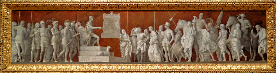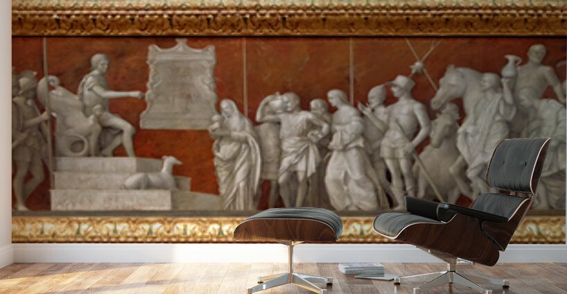 Bellini. The artwork shows a gathering of figures around Publius Cornelius Scipio in a historical setting. The scene captures an important moment of d