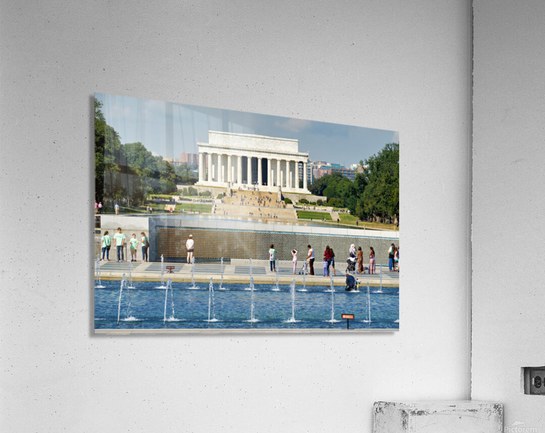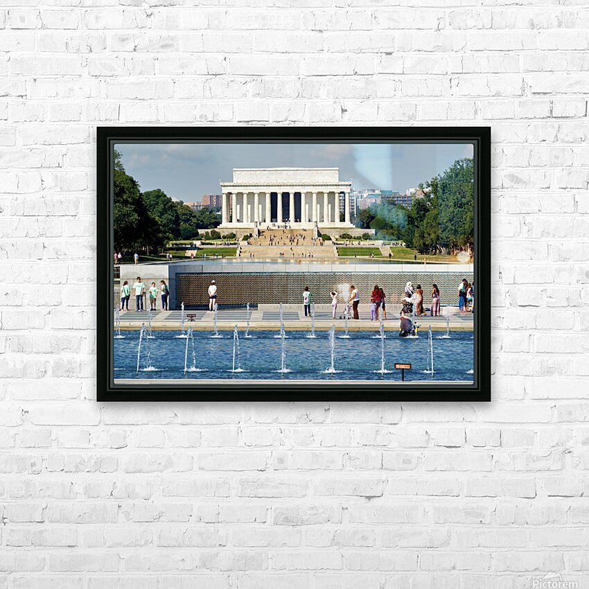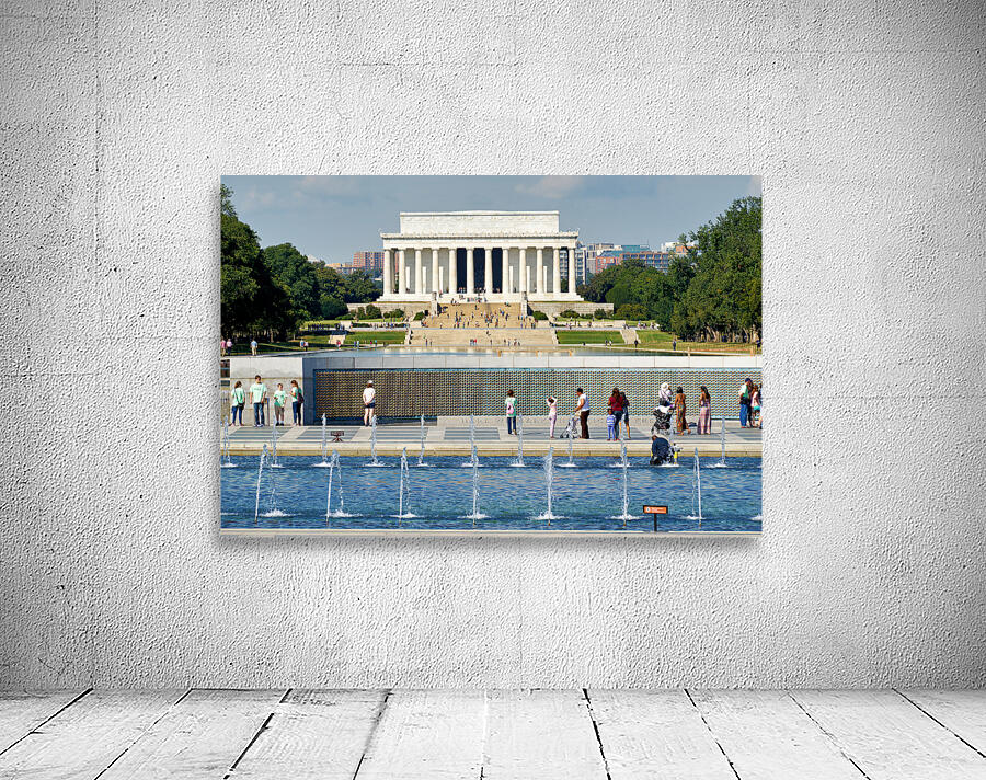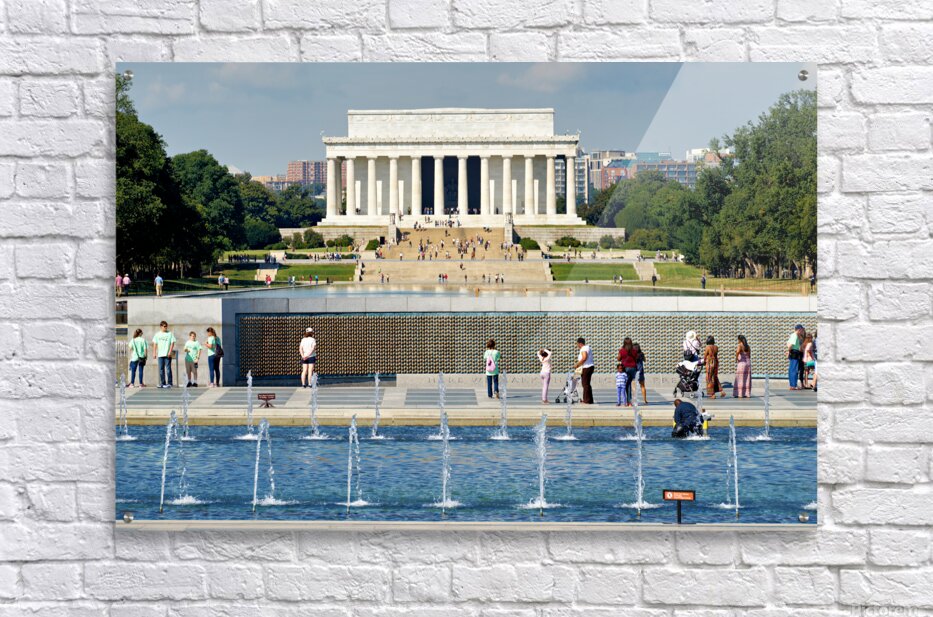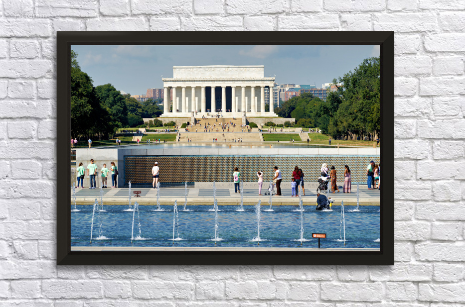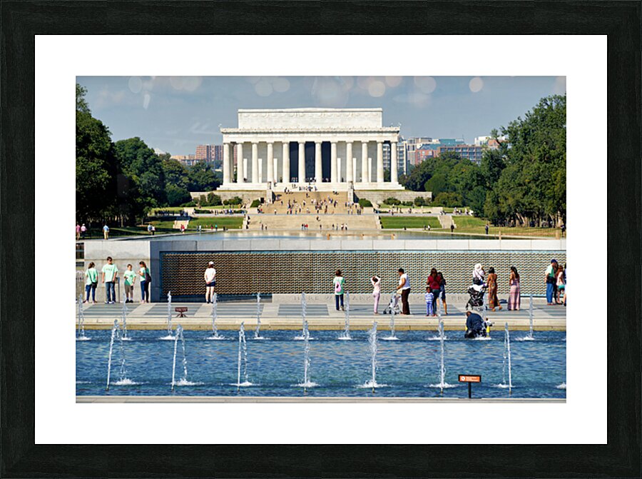 "Visitors walk around the National World War II Memorial" in a framed print.