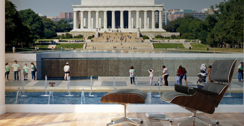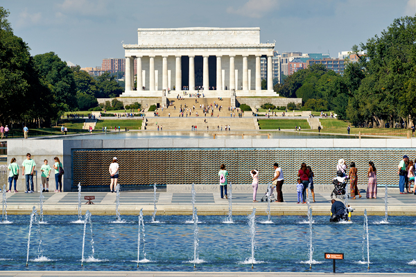 Visitors walk around the National World War II Memorial. In the background the Lincoln Memorial stands tall under a clear sky.