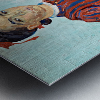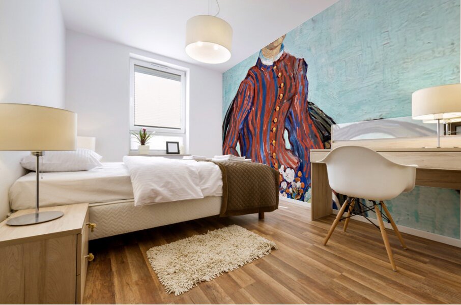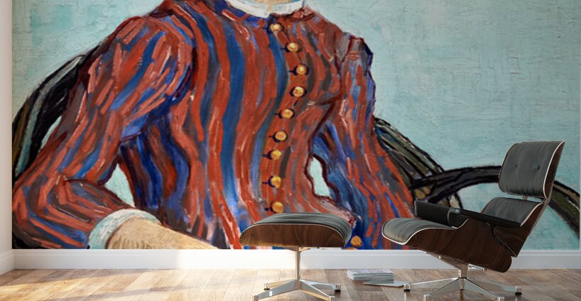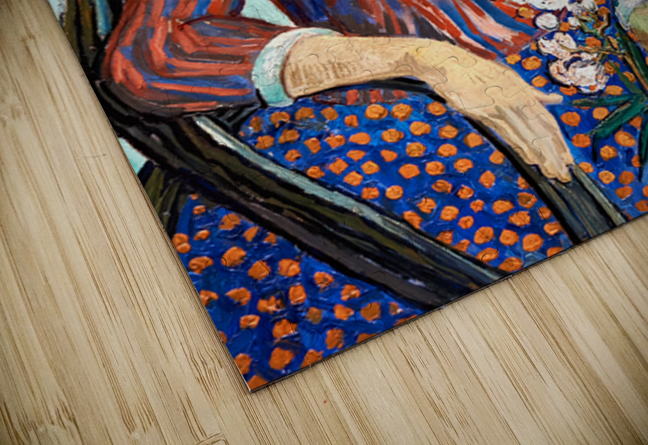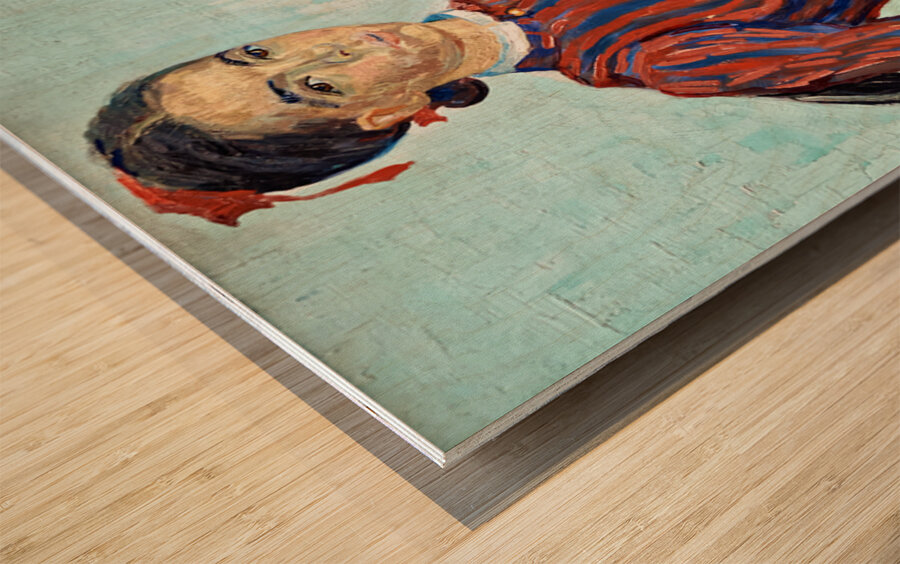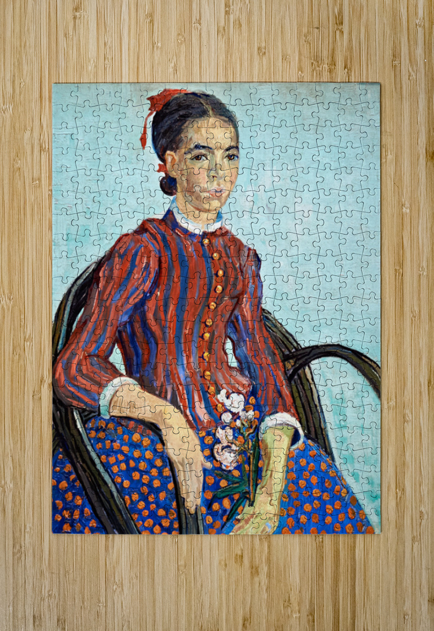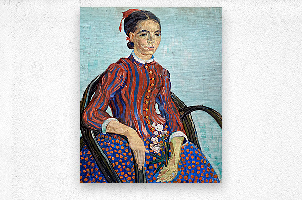 Vincent Van Goghs artwork shows a young woman holding flowers. The painting uses bright colors and strong brush strokes typical of his style.