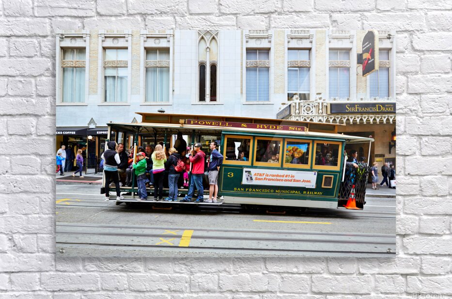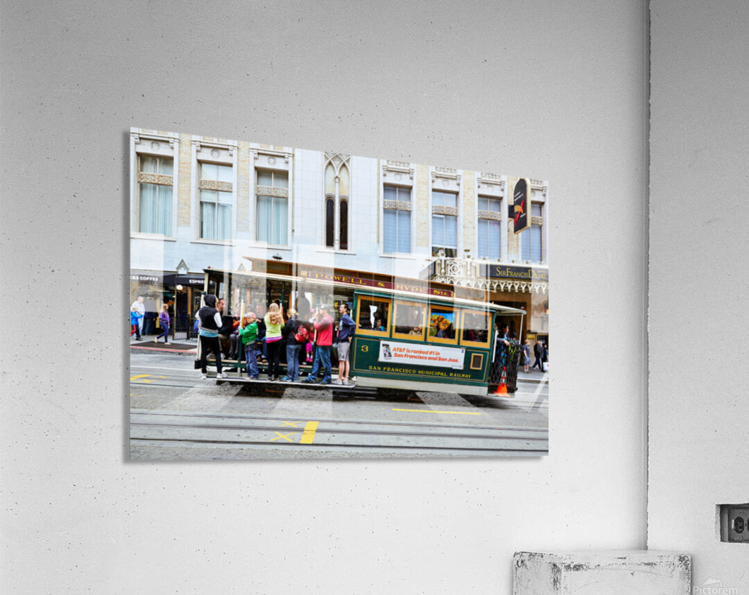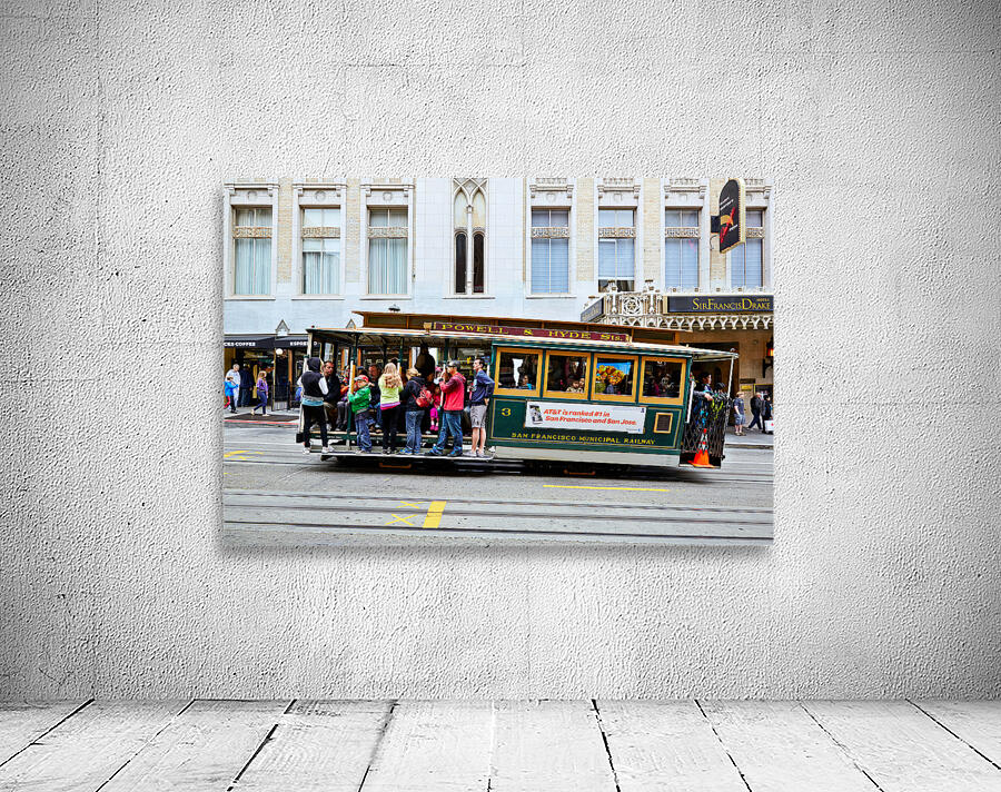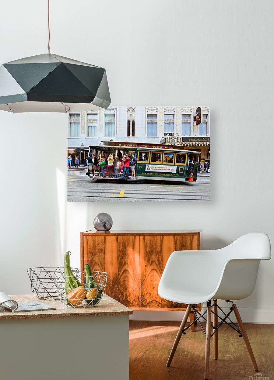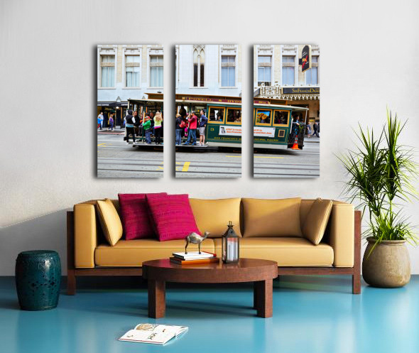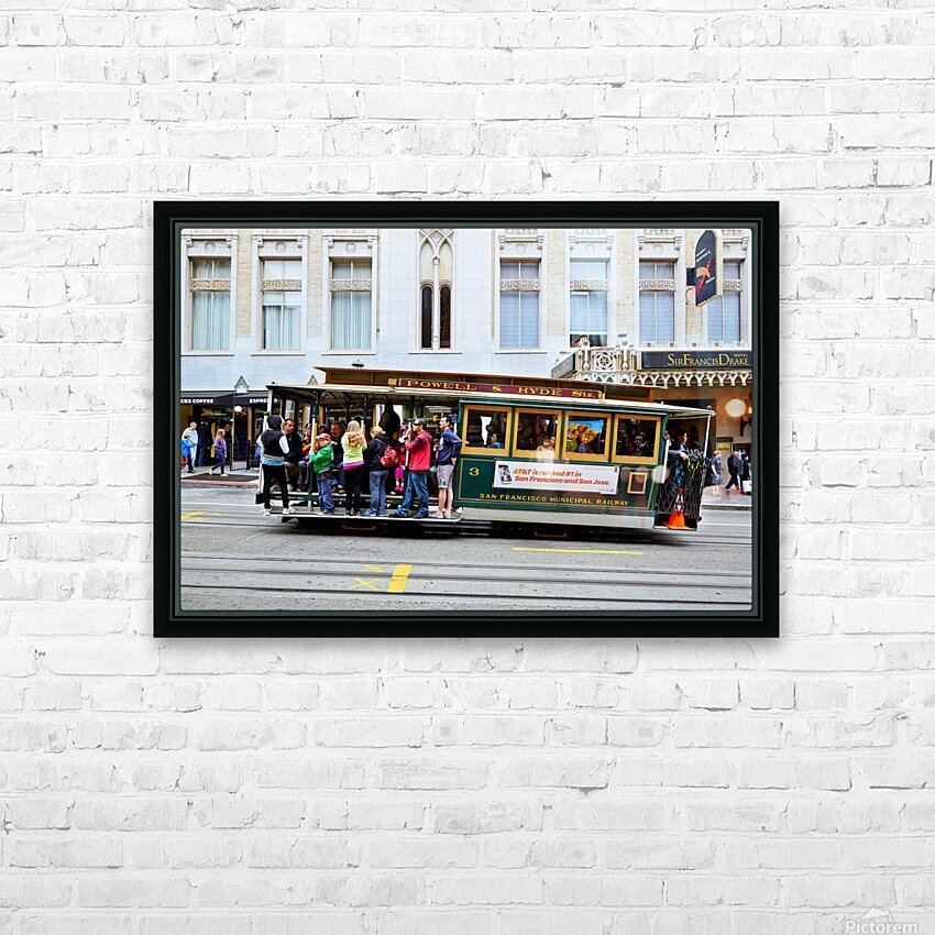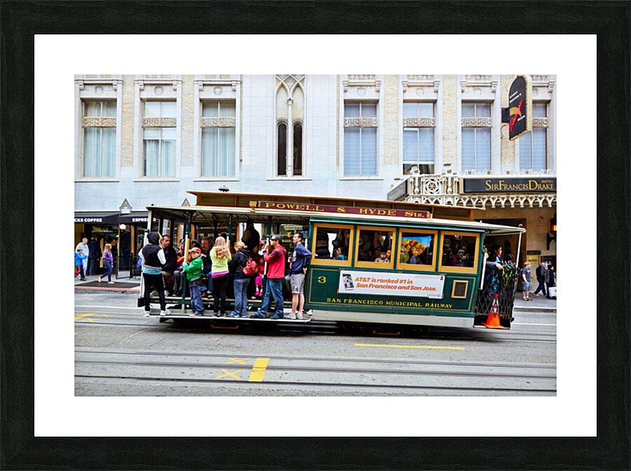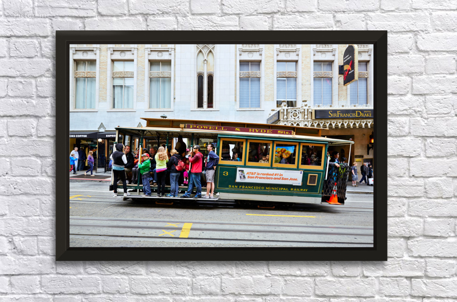 "Cablecar travels through streets of San Francisco" in a framed print.