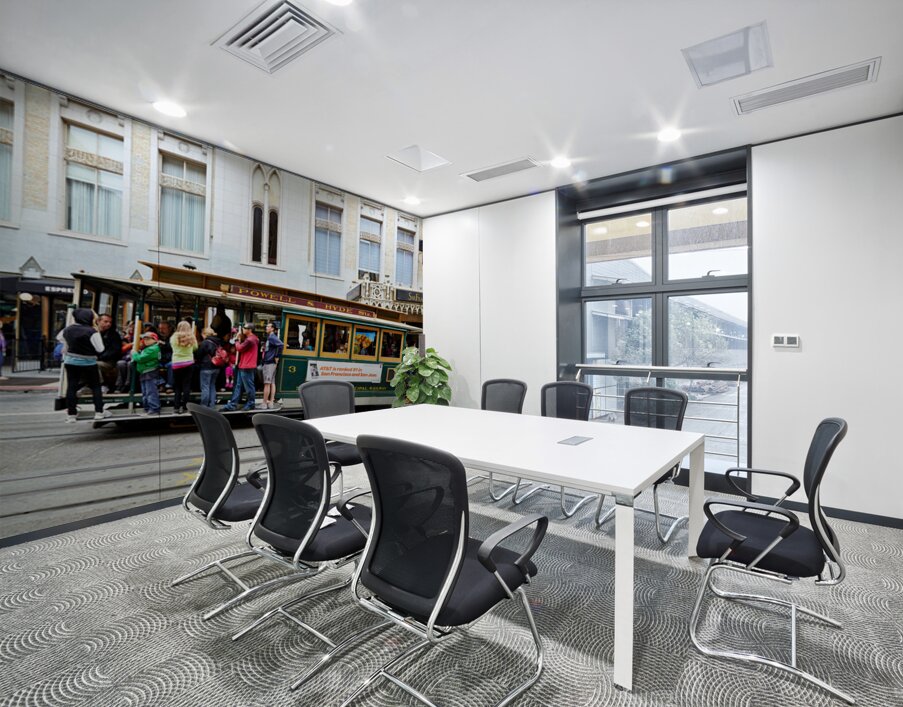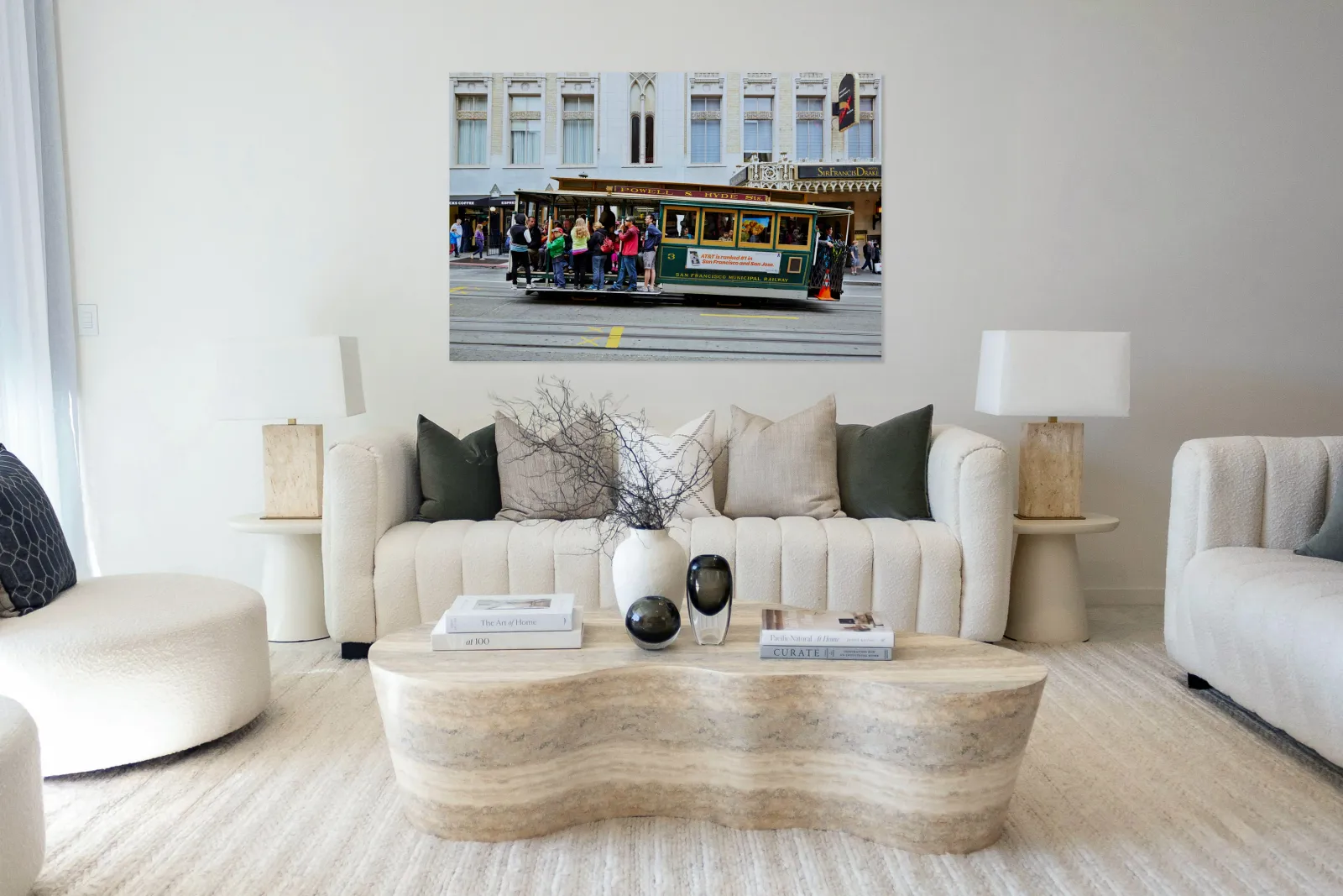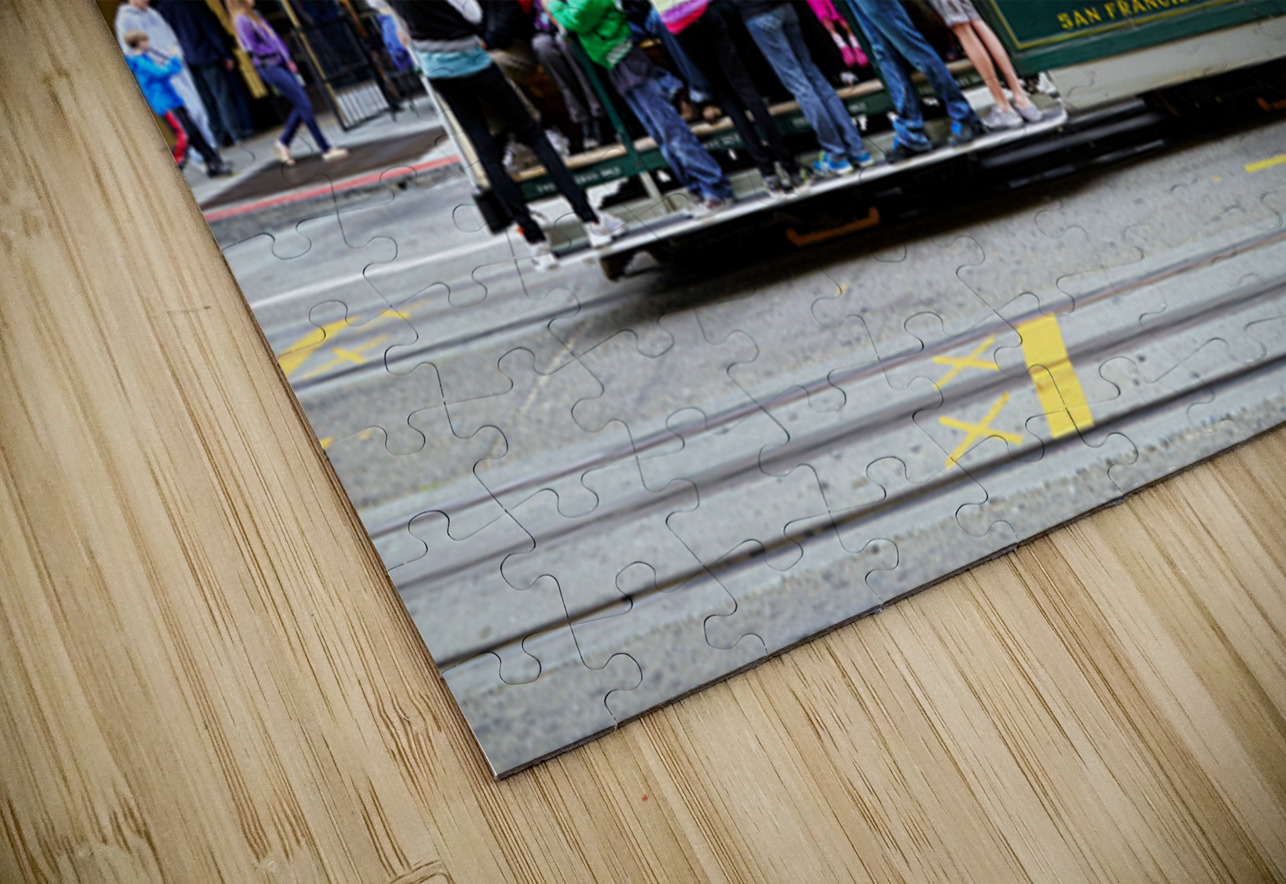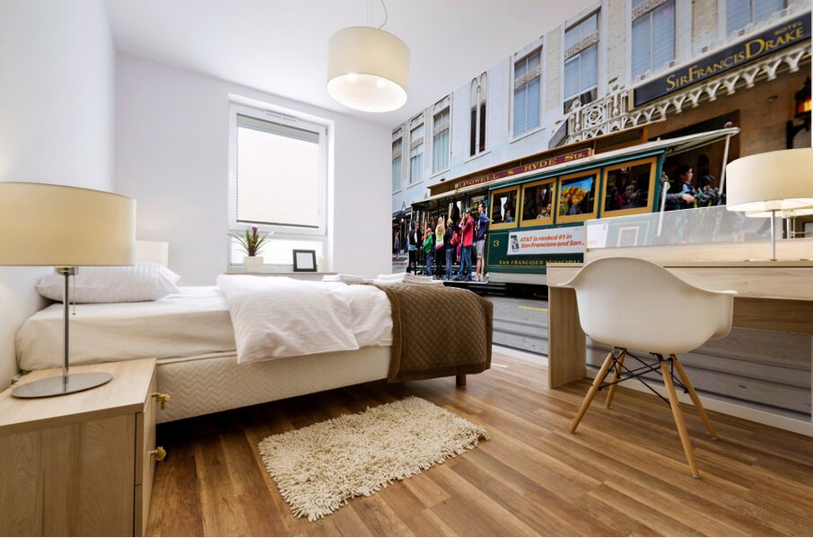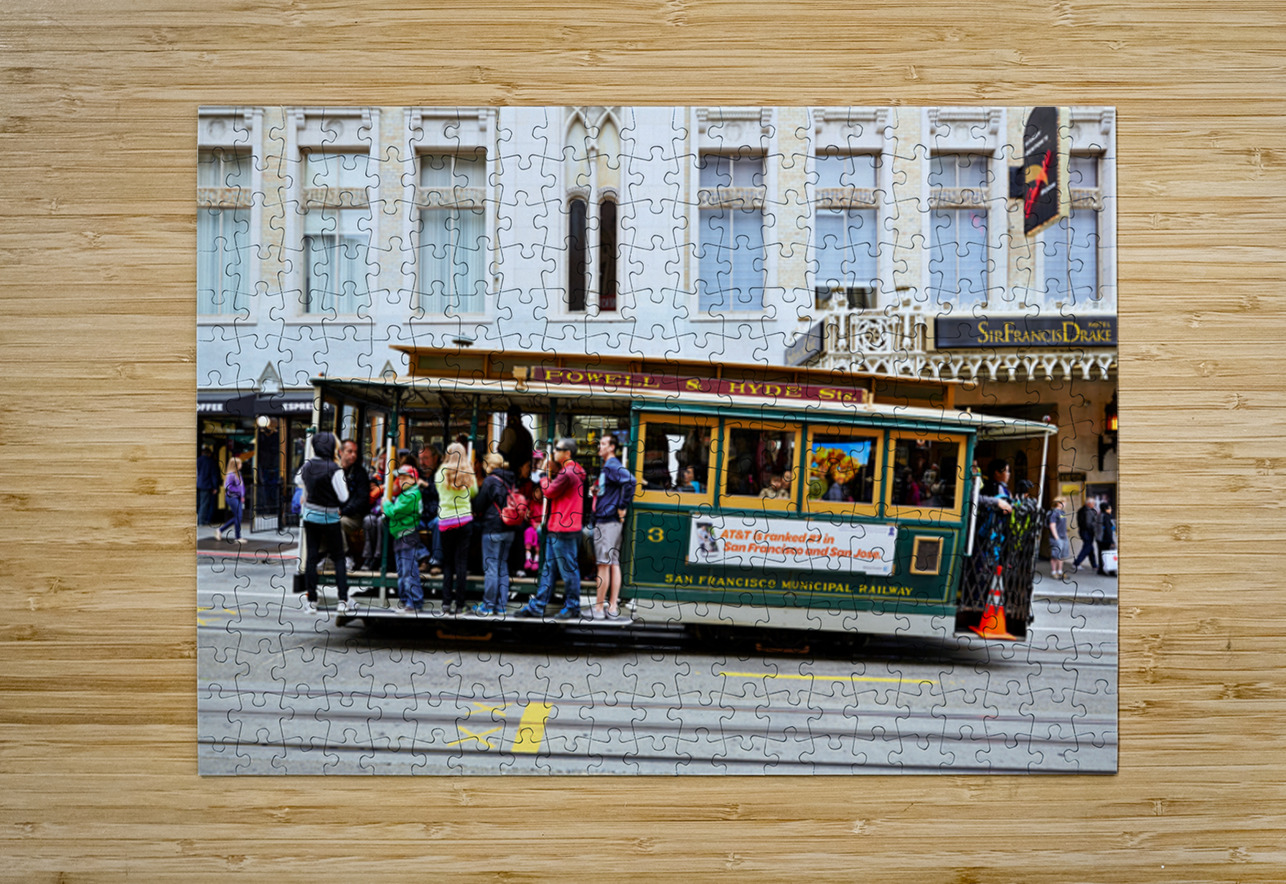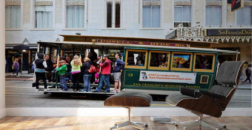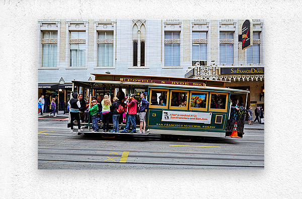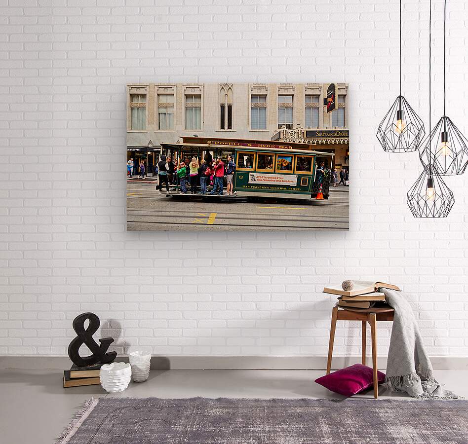 "Cablecar travels through streets of San Francisco" in a framed print.