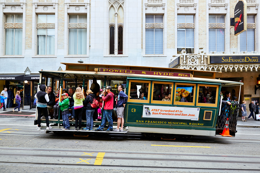 A cablecar moves along the streets of San Francisco. People are enjoying the ride as they explore the city.