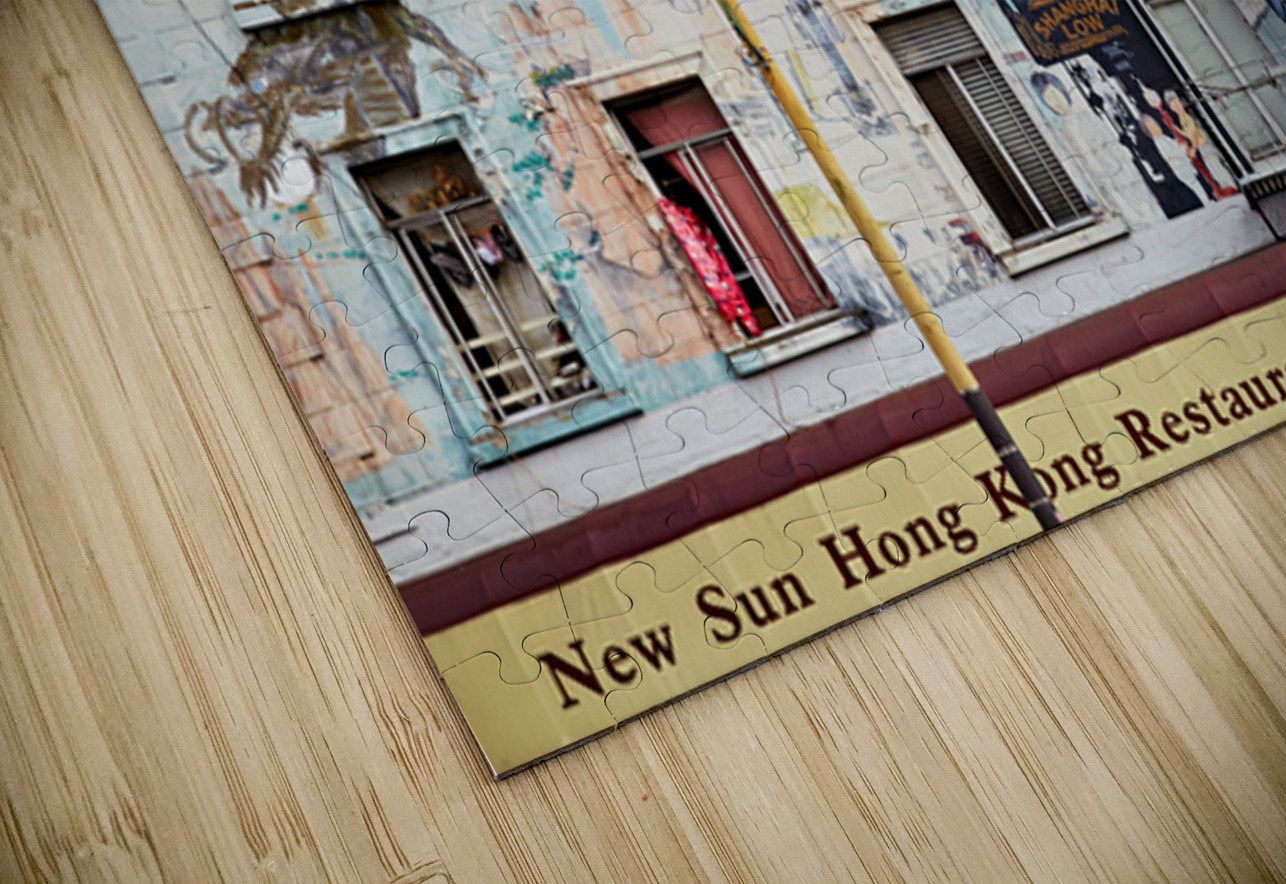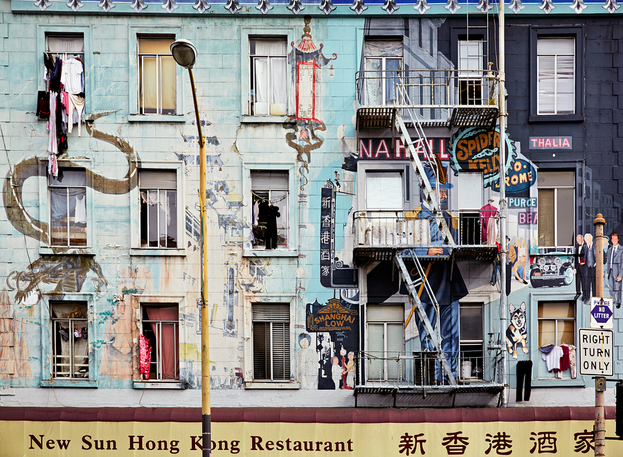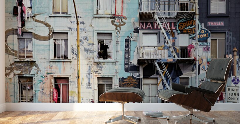 Murals and buildings show cultural art in Chinatown San Francisco. People hang clothes outside windows. The scene captures daily life in the area.