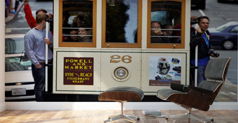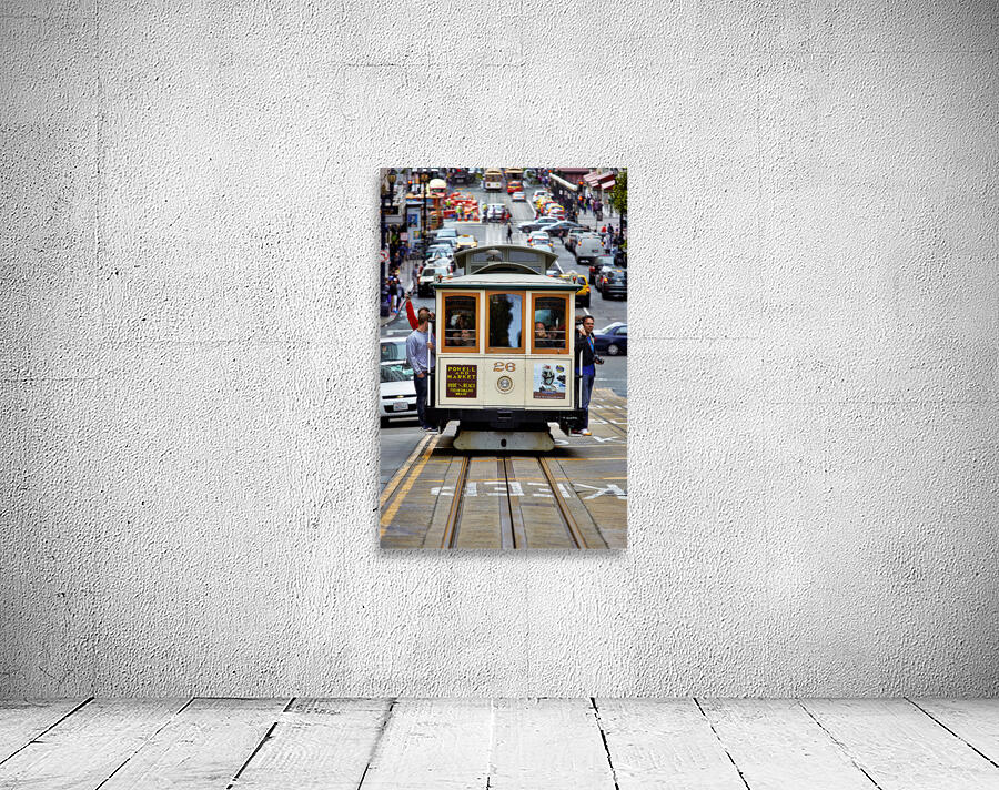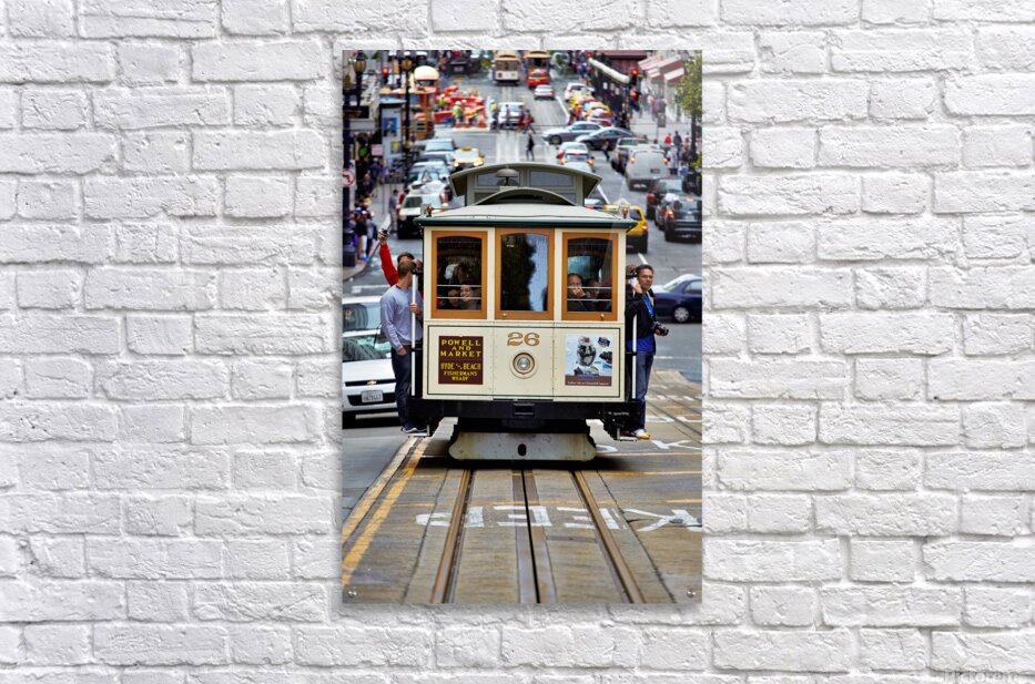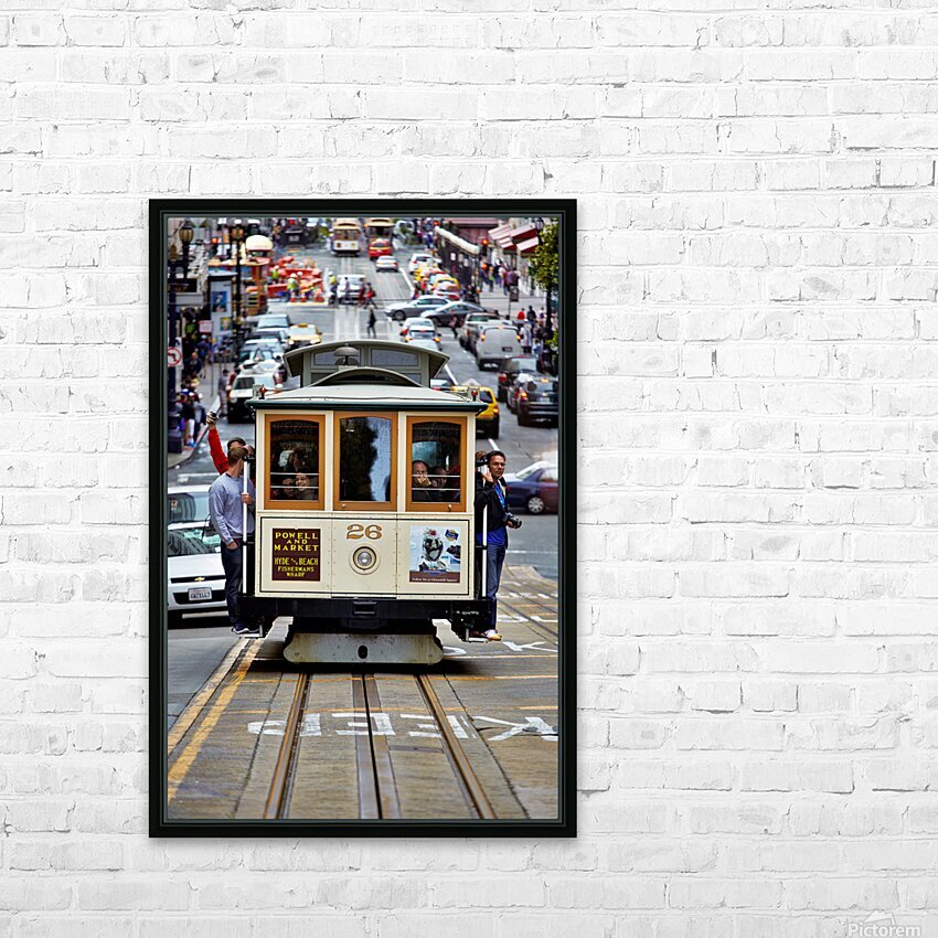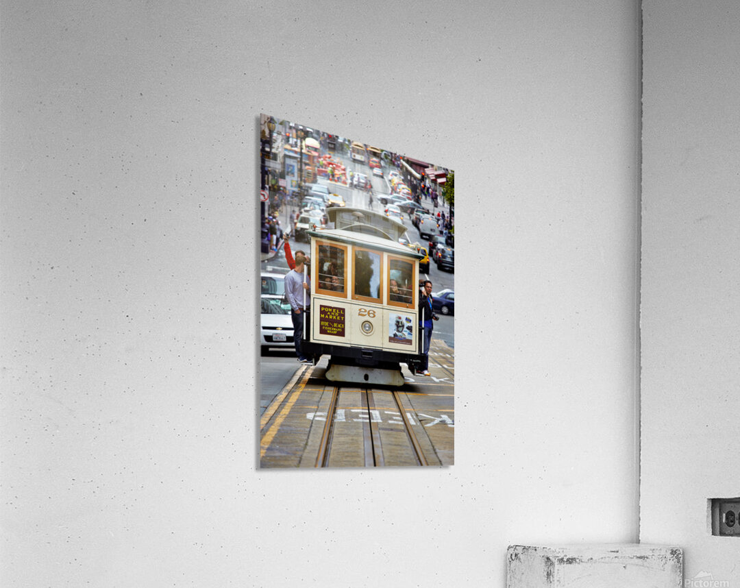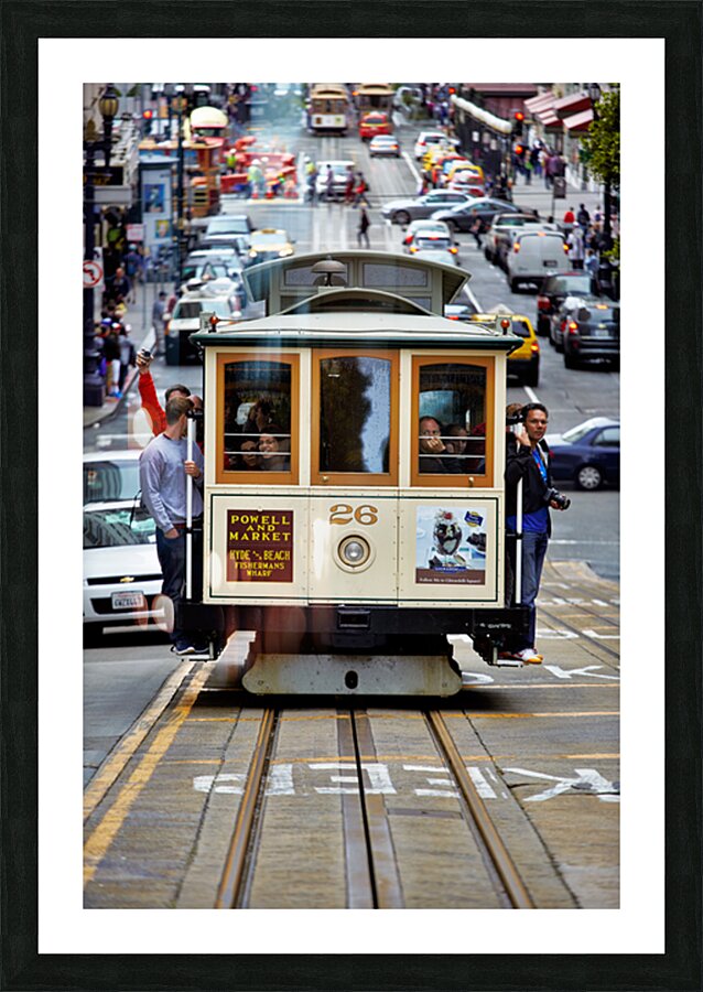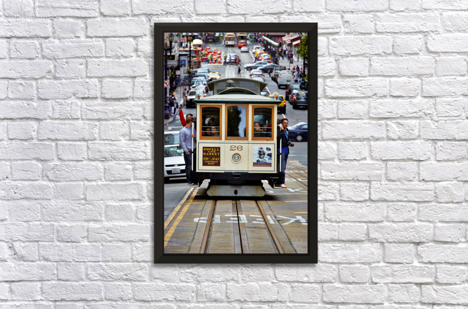 "Cable car travels through San Francisco streets" in a framed print.