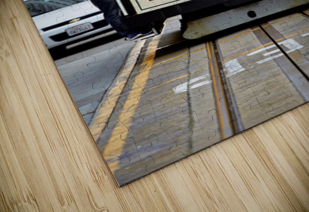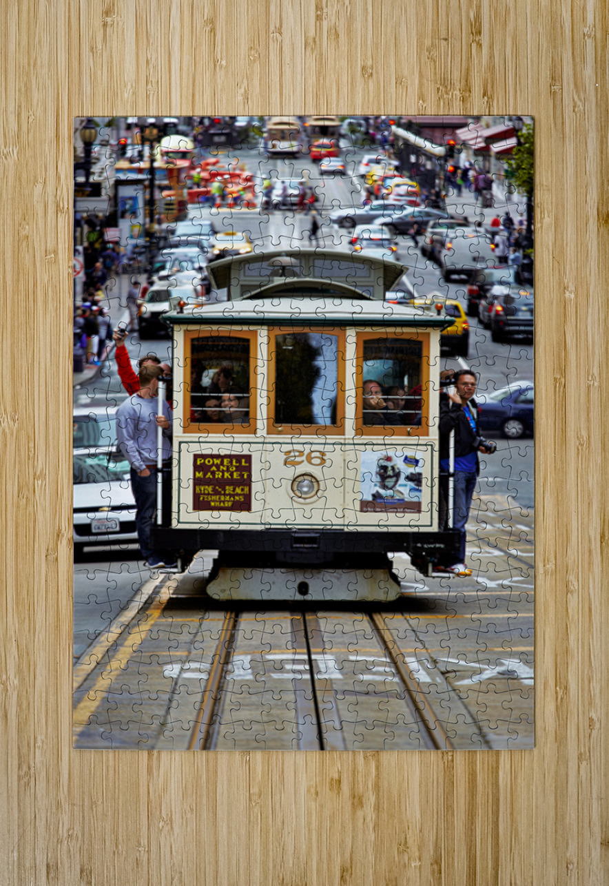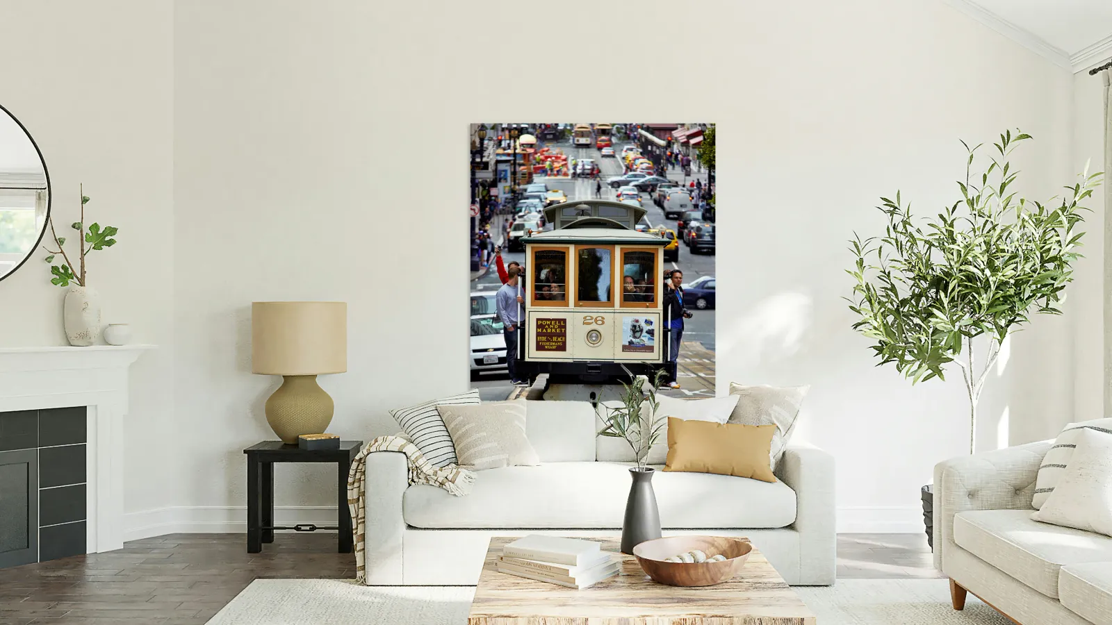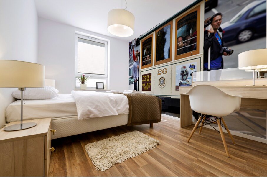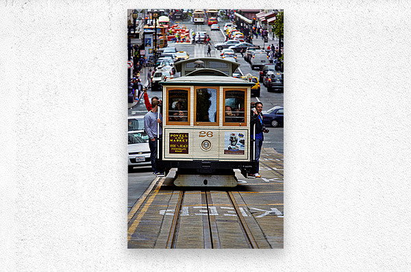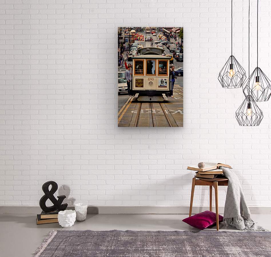 "Cable car travels through San Francisco streets" in a framed print.