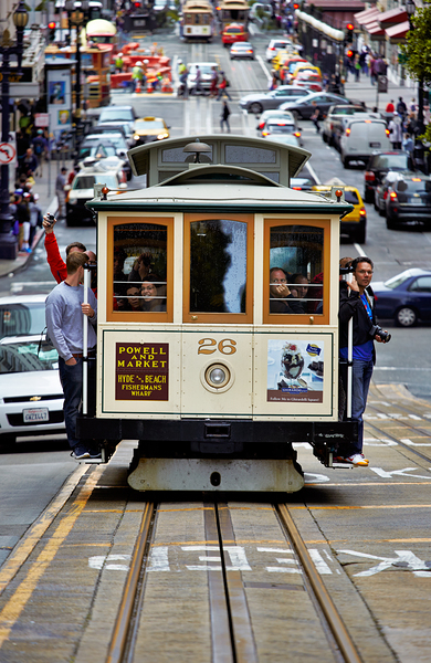 A cable car moves along the streets of San Francisco. People enjoy the views from the car. The scene shows busy traffic and city life.