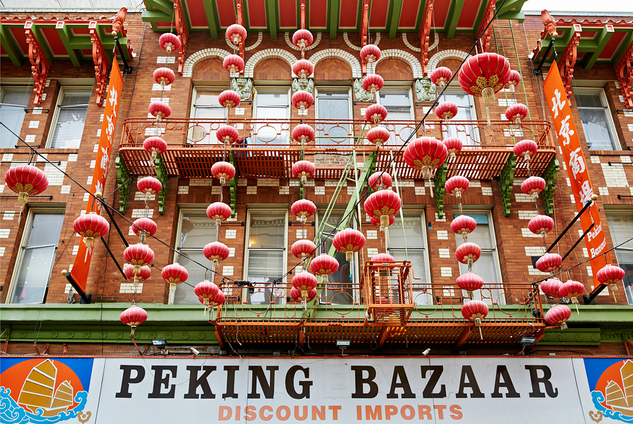 People walk by Peking Bazaar in Chinatown San Francisco. Red lanterns decorate the building. The shop offers various imports and items.