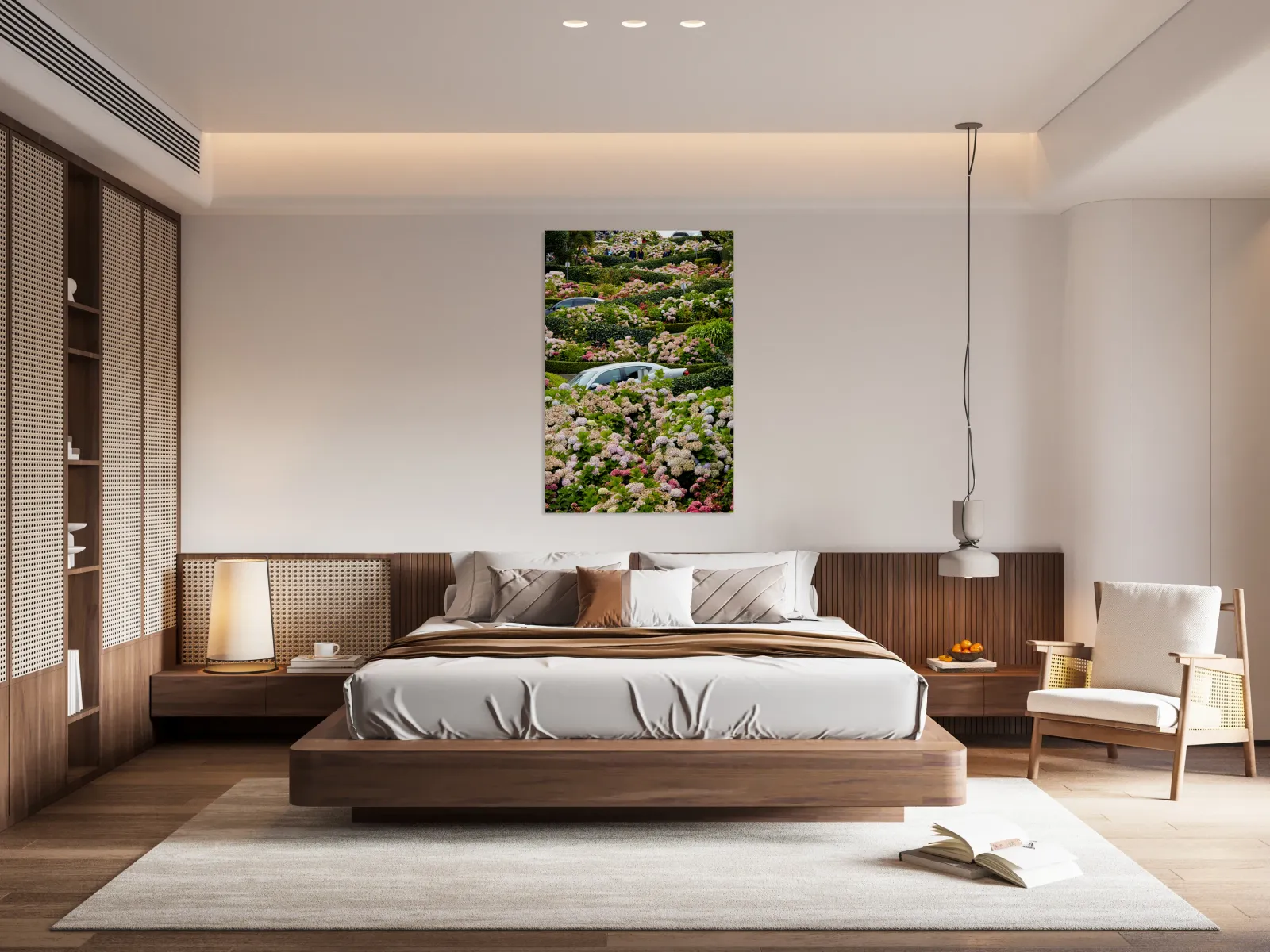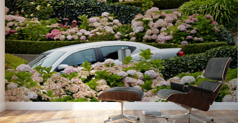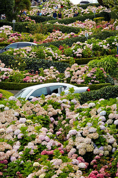 People walk along the curvy road of Lombard Street lined with blooming flowers. Cars pass through the vibrant floral scenery in San Francisco.