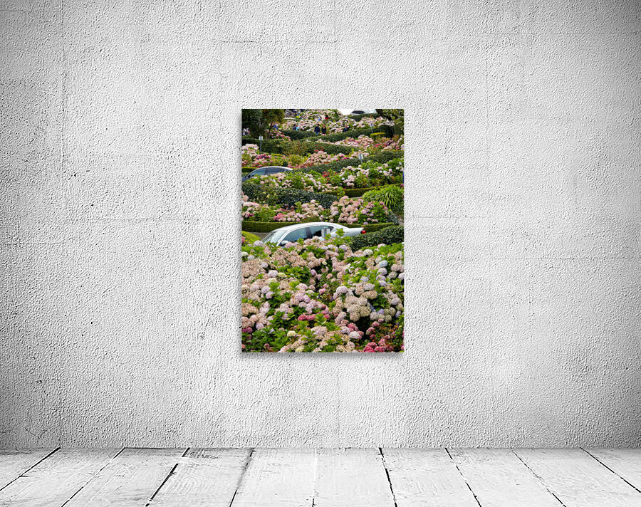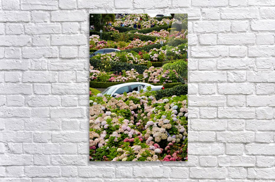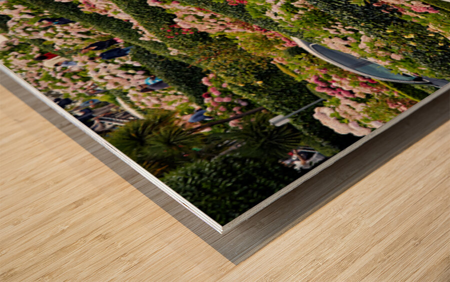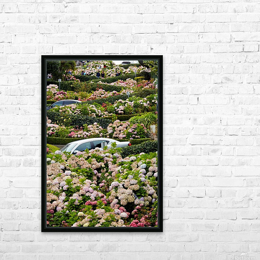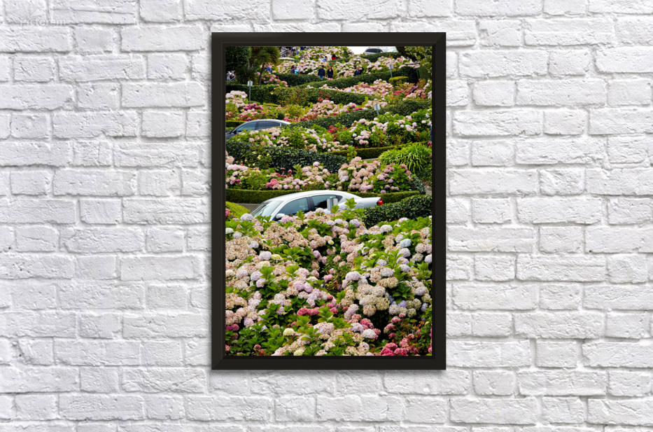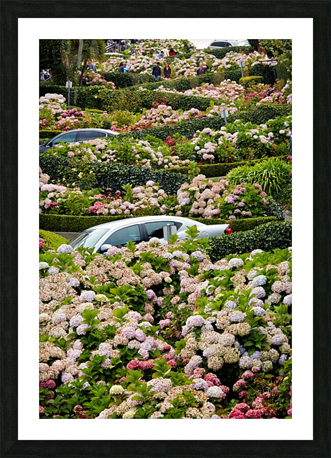 "Visitors stroll Lombard Streets winding paths" in a framed print.