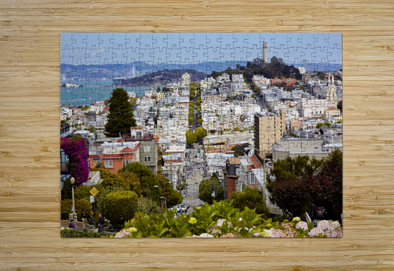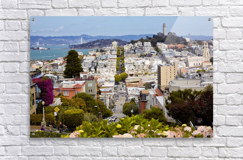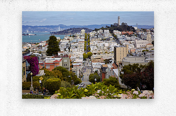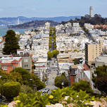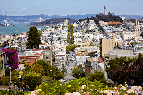 People walk along streets in San Francisco near Telegraph Hill with views of Coit Tower and the Bay Bridge in the background on a clear day.